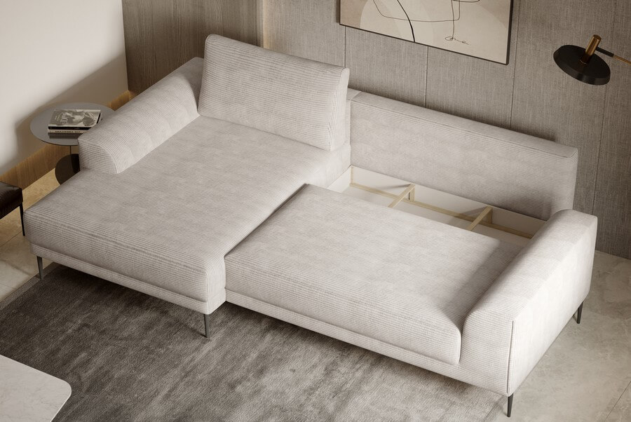 Narożnik Capitol to elegancki i prosty w formie mebel, który z powodzeniem wkomponuje się w różnorodne wnętrza. Jego wyjątkowy design sprawia, że jest idealnym rozwiązaniem do salonu, pokoju dziennego czy nawet sypialni. Jego znaczącą cechą jest przestronny pojemnik na pościel, który pozwala na przechowywanie dodatkowych koców, poduszek czy innych akcesoriów do snu. To szczególnie przydatne rozwiązanie w przypadku mniejszych przestrzeni.