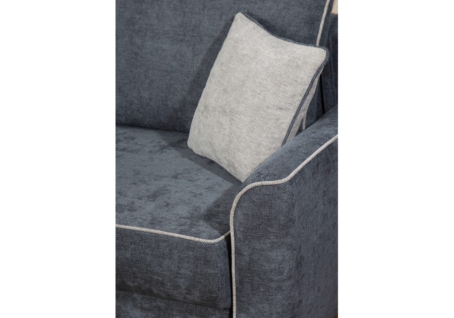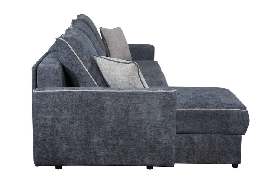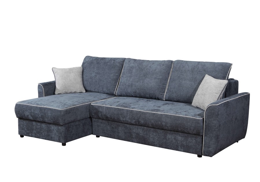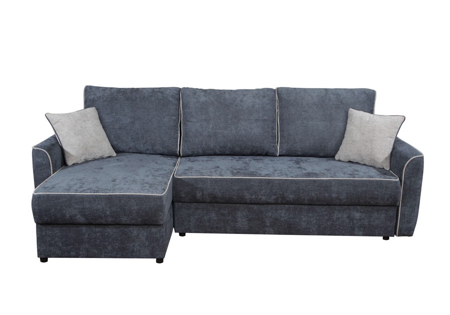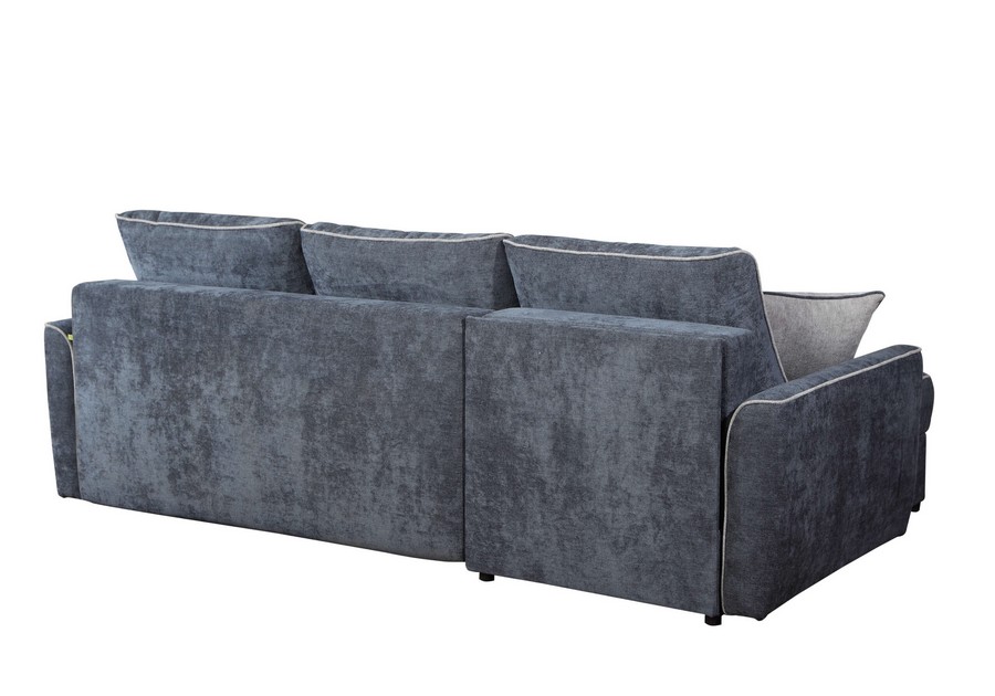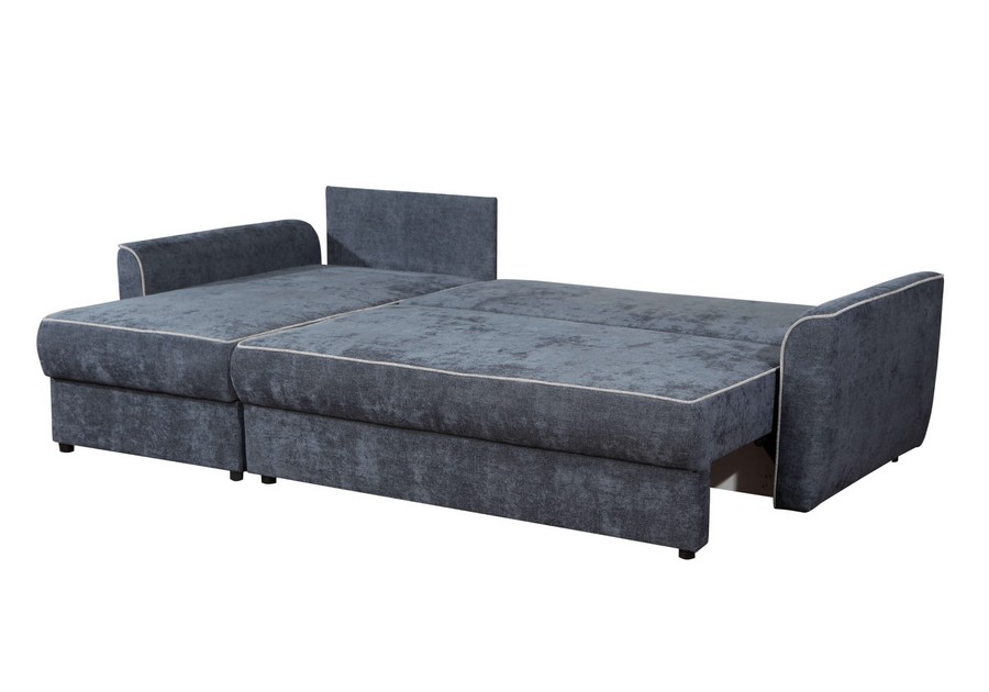 Model Cortez wyróżnia się elegancką lamówką oraz dekoracyjnymi jaśkami, które można wybrać w kontrastowym kolorze, nadając wnętrzu indywidualnego charakteru. Funkcja spania codziennego z mechanizmem DL pozwala łatwo rozłożyć narożnik i uzyskać dostęp do pojemników na pościel.