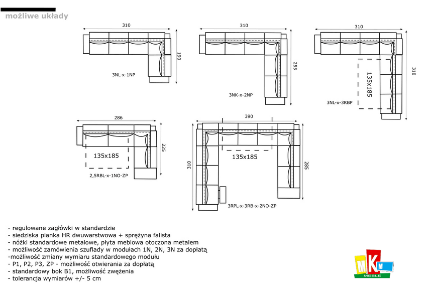 Wymiary: szerokość 335 x 190 cm, wysokość 80/100 cm, pow. spania 135 x 185 cm, głębokość 108 cm.