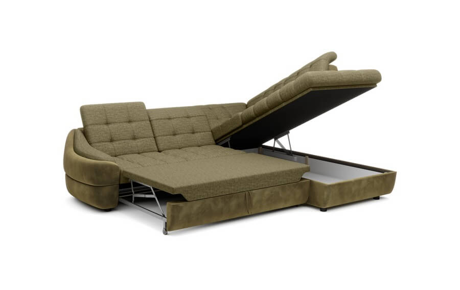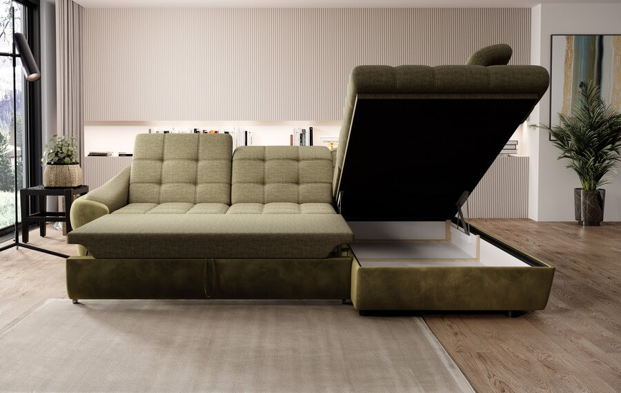 Jedną z najpraktyczniejszych funkcji Infinity L jest możliwość przekształcenia go w wygodne łóżko dzięki specjalnemu automatu do rozkładania typu „delfin”. Dodatkowo, mebel posiada pojemnik na pościel ukryty w otomanie