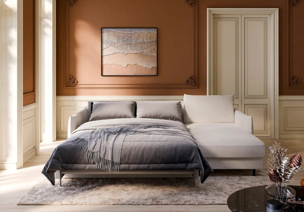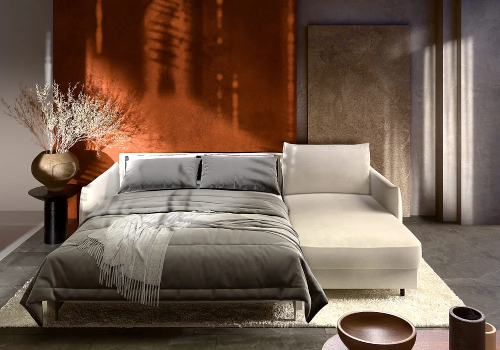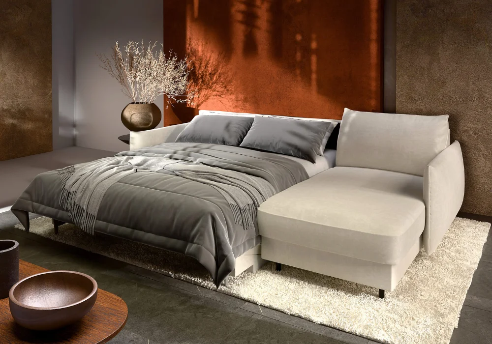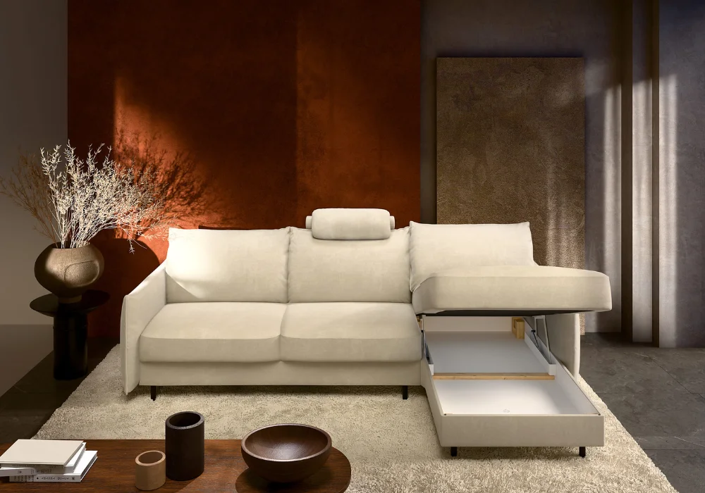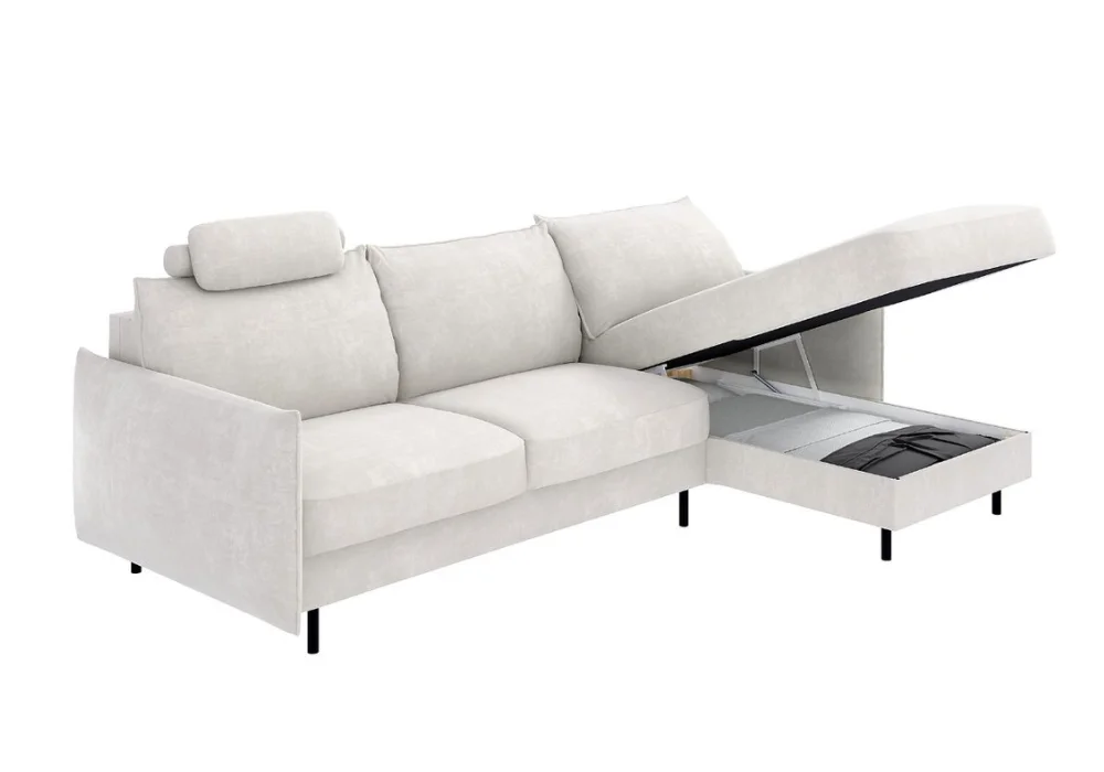 Funkcja spania oparta na stelażu włoskim oraz wygodny materac tworzą pełnoprawne miejsce do nocnego odpoczynku, a pojemnik w otomanie ułatwia przechowywanie pościeli i koców. Całość uzupełniają czarne nóżki z tworzywa, które dodają meblowi lekkości wizualnej i ułatwiają utrzymanie porządku.