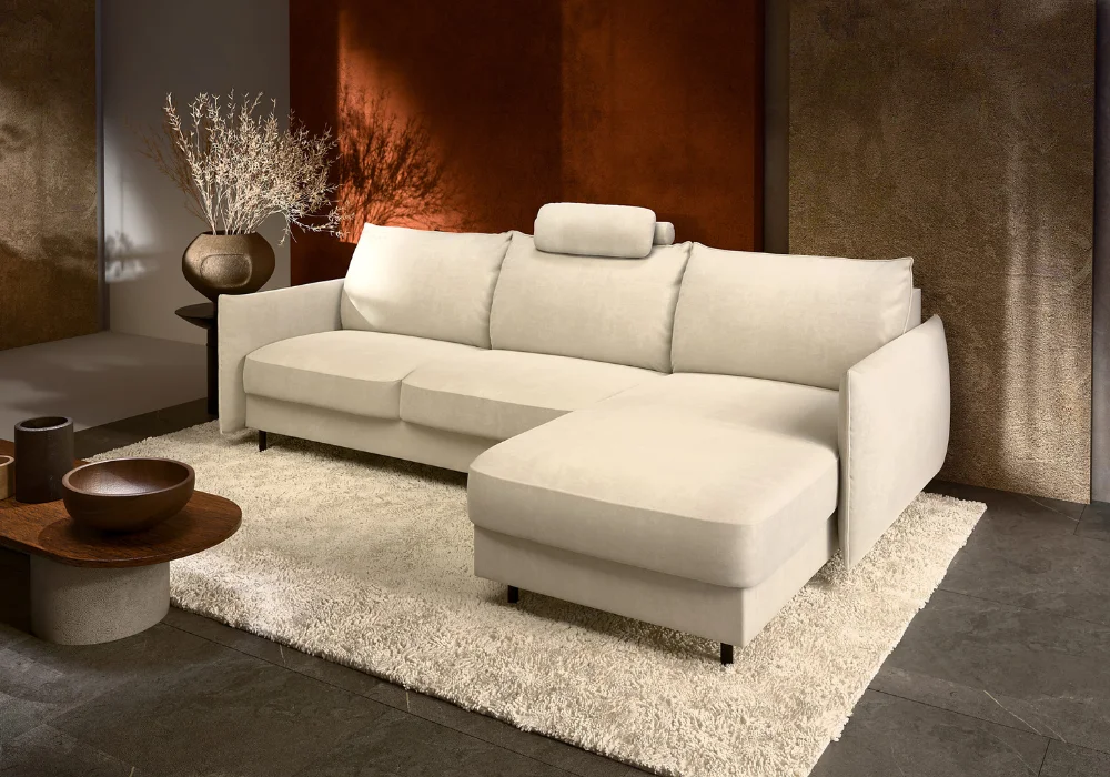 Uniwersalna bryła narożnika sprawia, że łatwo dopasować go do różnych stylów wnętrz – od bardziej minimalistycznych po mieszkania z nutą nowoczesnej przytulności.