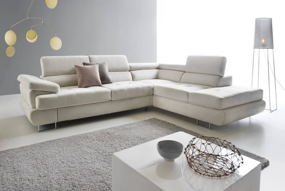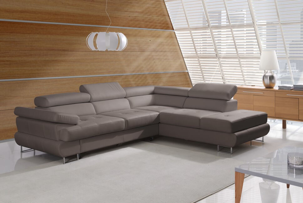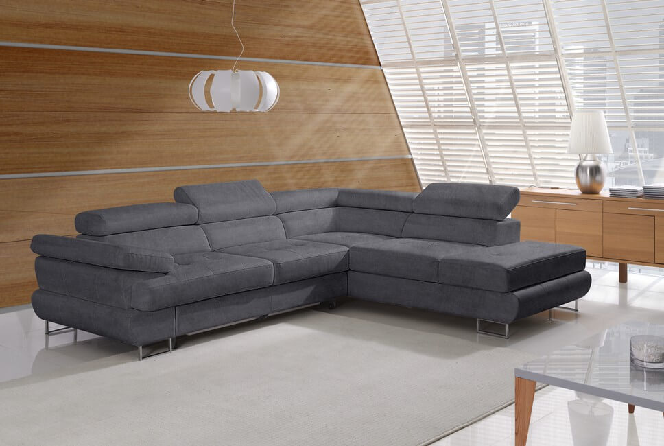 Komfortowy i funkcjonalny narożnik LUTON z funkcją spania i pojemnikiem na pościel. Komfortowego użytkowania zapewniają wygodne siedziska i oparcia oraz ruchome zagłówki.
