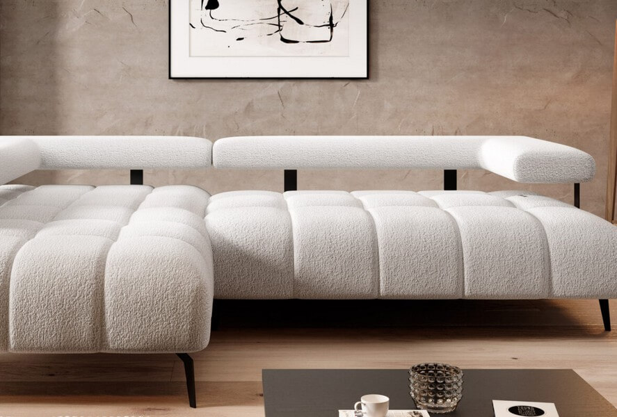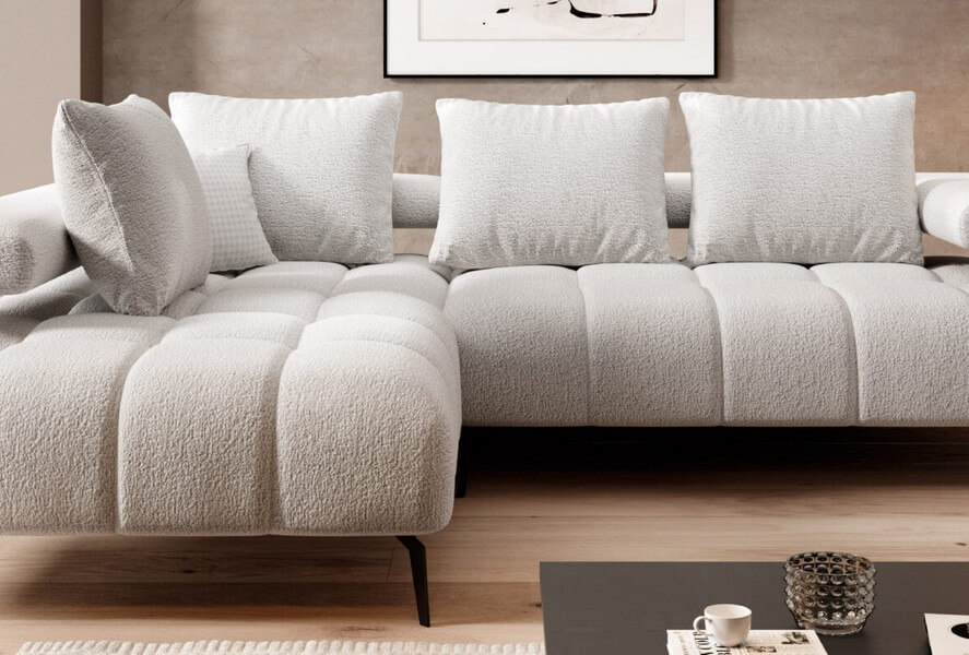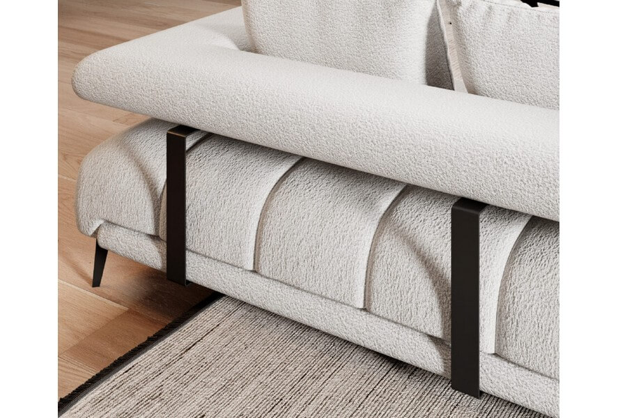 Wysokie, metalowe nogi narożnika dodają mu subtelnej lekkości, tworząc wrażenie unoszenia się mebla w przestrzeni. To również element, który doskonale komponuje się z nowoczesnym charakterem kolekcji.