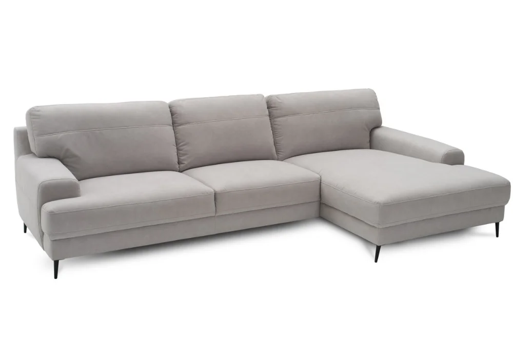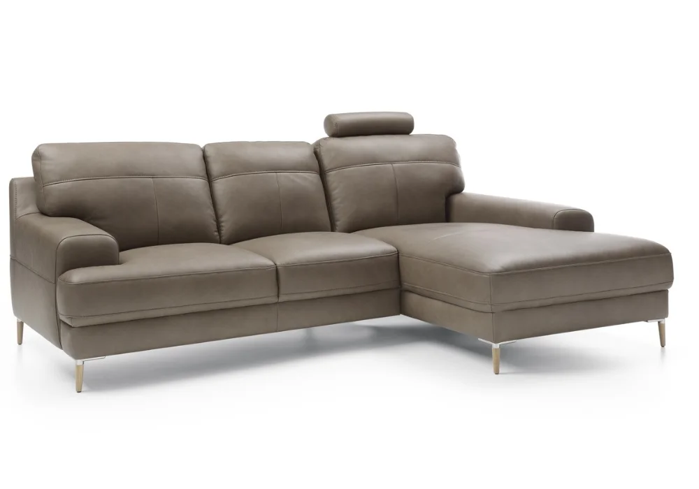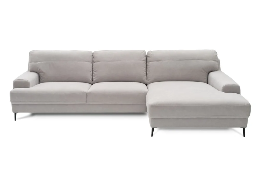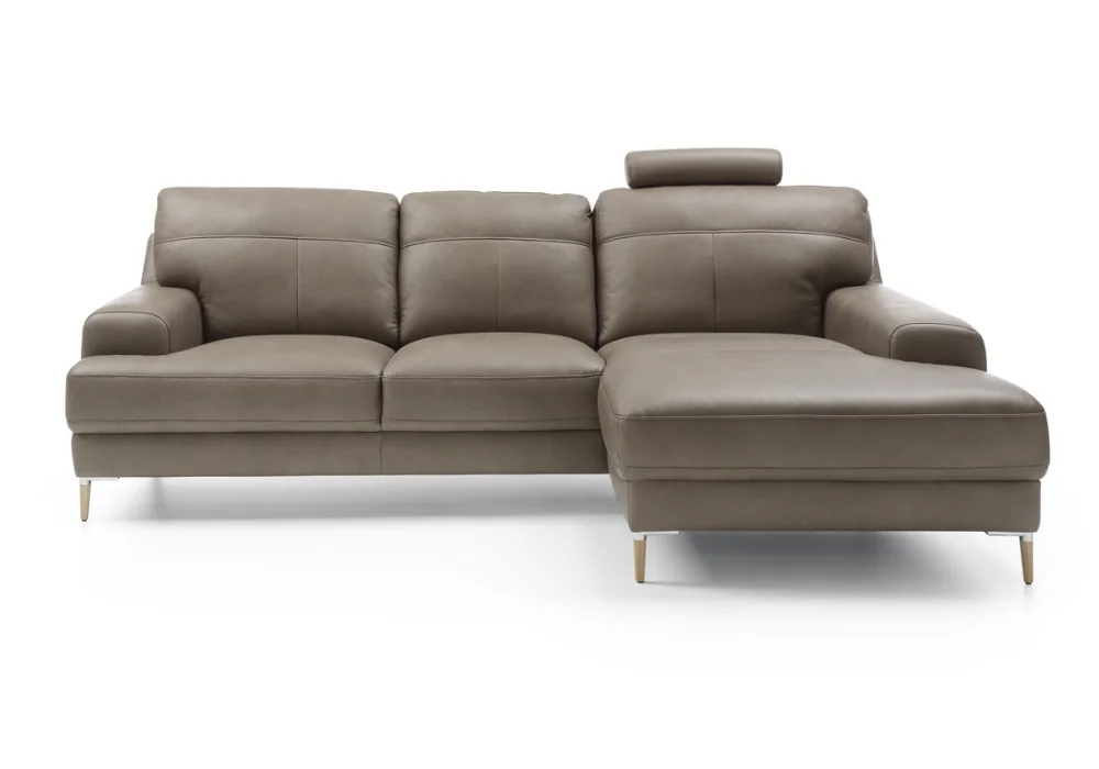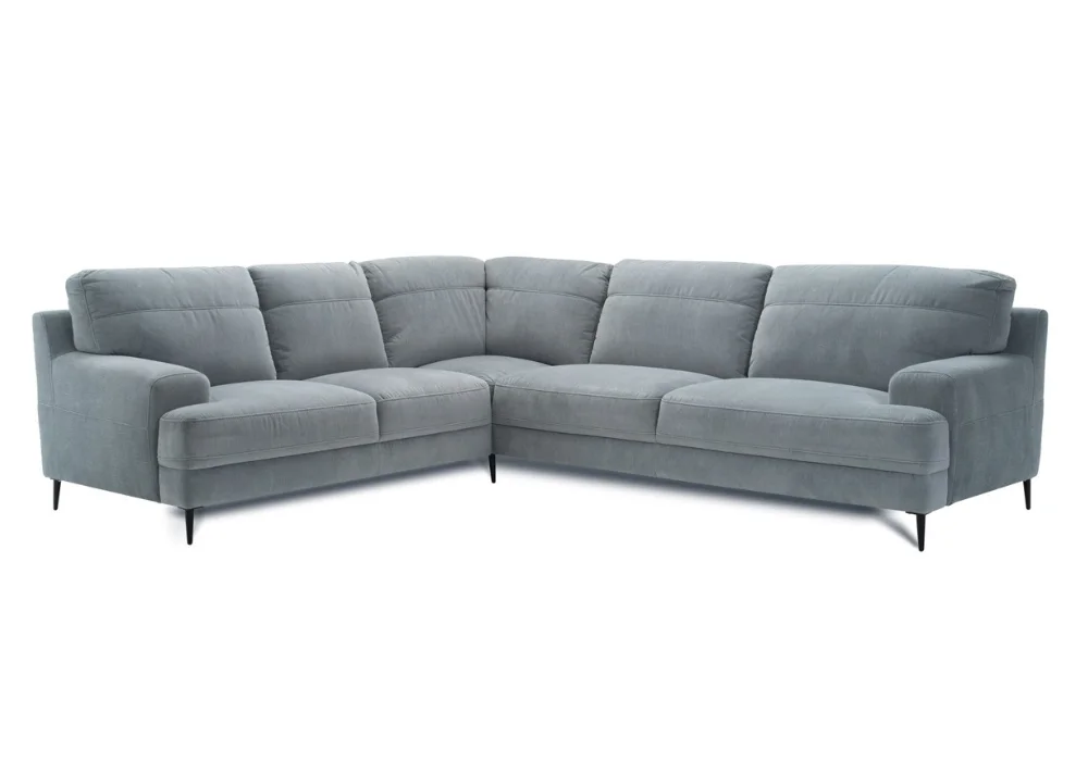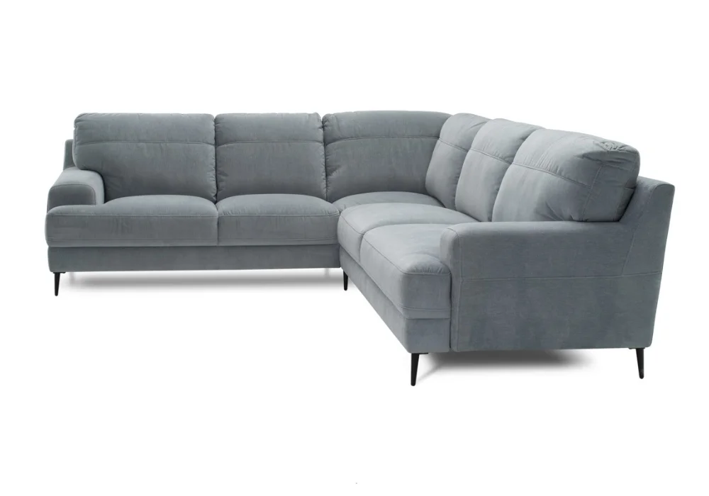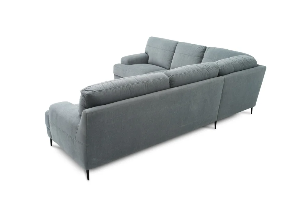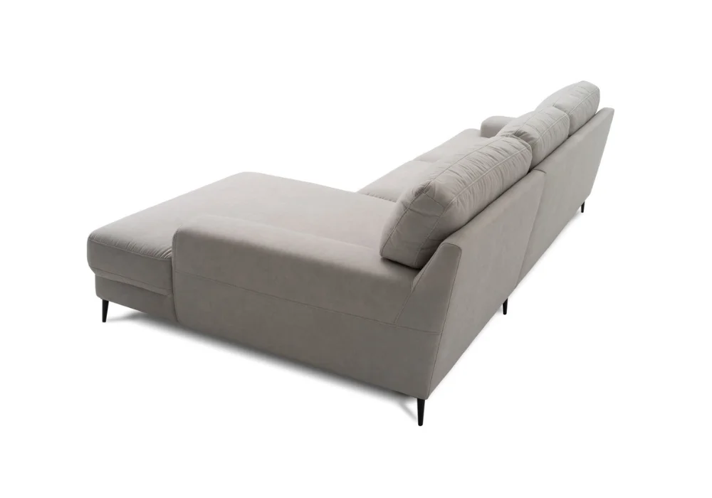 Monday świetnie odnajduje się w nowoczesnych aranżacjach. Wysokie nóżki, do wyboru drewniane lub czarne metalowe, dodają bryle lekkości i ułatwiają sprzątanie, także robotem sprzątającym. Narożnik równie dobrze wygląda w tkaninie, jak i w skórze naturalnej, a szeroka paleta kolorów pozwala dopasować go dokładnie do charakteru wnętrza. Dla osób ceniących dodatkowe wsparcie dostępne są opcjonalne zagłówki, które można zamontować na wybranych oparciach.