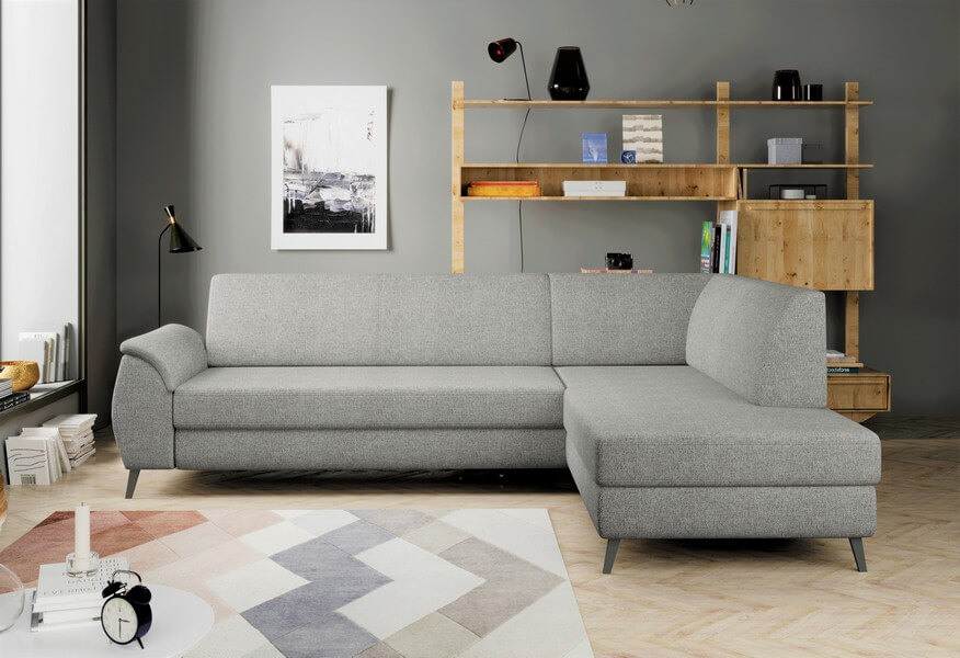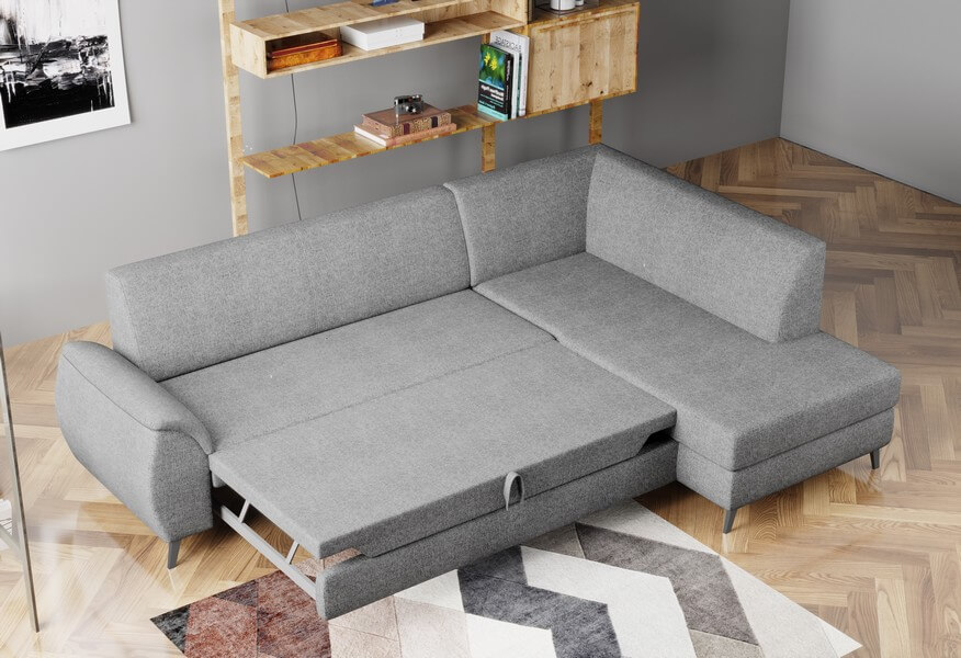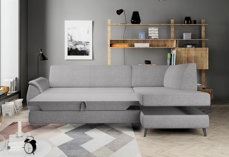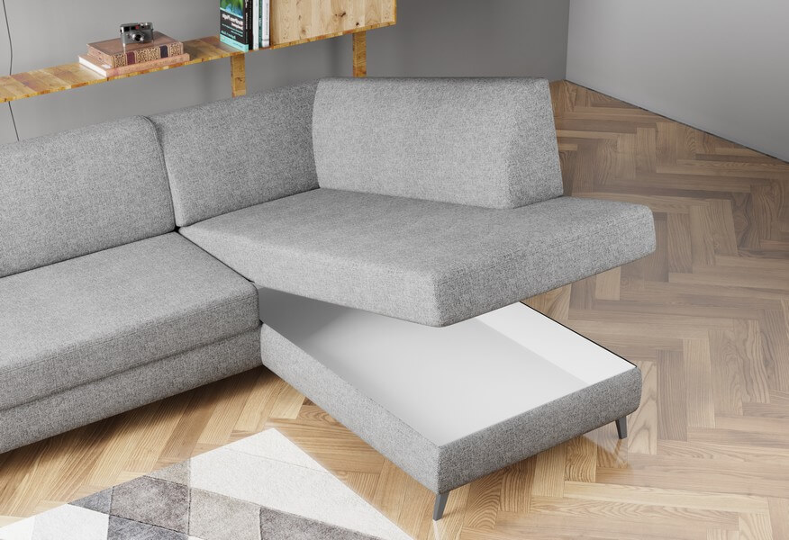 Jednym z praktycznych rozwiązań, które oferuje ten narożnik, jest funkcja spania typu Delfin. Dzięki niemu można w szybki sposób przekształcić mebel w wygodne łóżko, idealne dla gości lub jako dodatkowe miejsce do snu w małych przestrzeniach. Dodatkowo, narożnik Mundo L został wyposażony w ukryty pojemnik w otomanie. To funkcjonalne rozwiązanie, które pozwala na przechowywanie dodatkowego kompletu pościeli, koca czy poduszek, bez potrzeby zajmowania dodatkowej przestrzeni w pokoju.