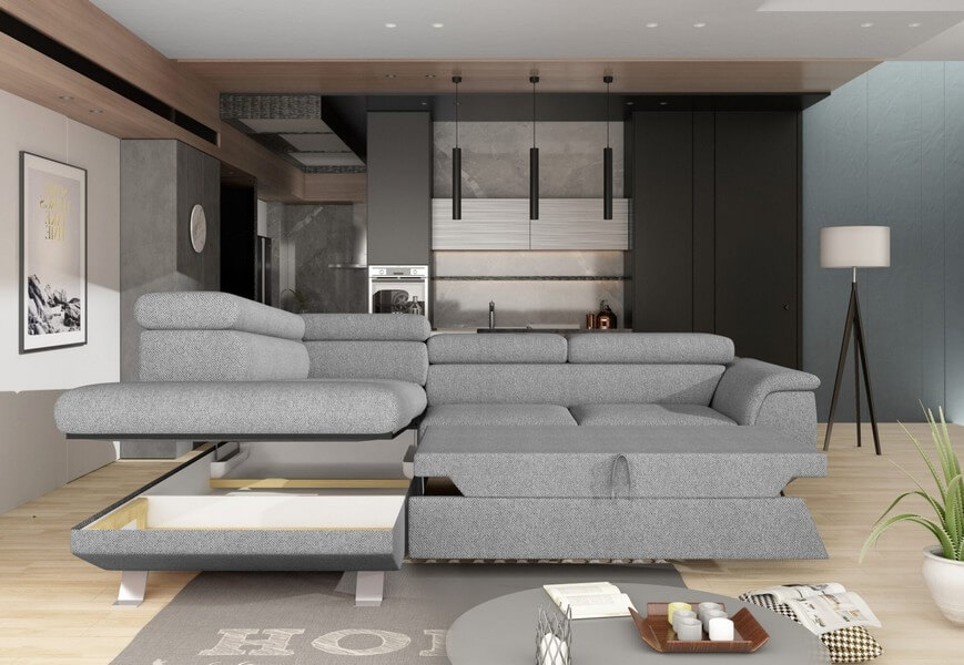 Nie tylko komfort, lecz również praktyczność jest kluczowym elementem narożnika Phoenix. System rozkładania Delfin pozwala na szybkie i wygodne przekształcenie mebla w miejsce do spania. Pojemnik na pościel to kolejna praktyczna funkcja – dzięki niemu, pościel, koce czy poduszki mogą być schowane w sposób dyskretny, pozostając jednocześnie łatwo dostępne, kiedy są potrzebne.