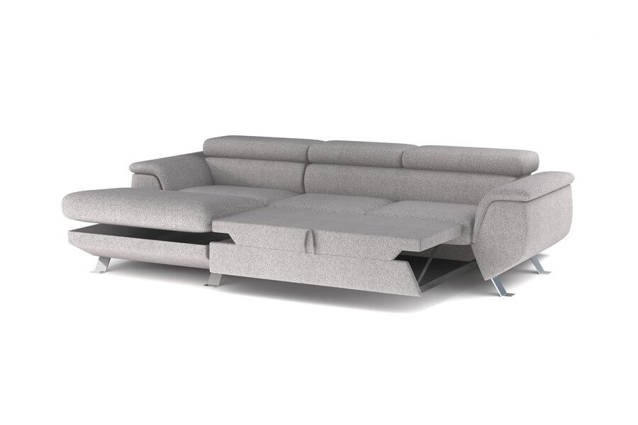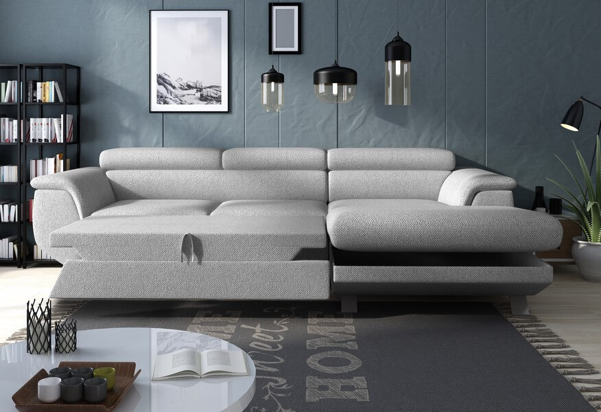 Ruchome zagłówki to jedna z kluczowych cech Phoenix Mini, pozwalająca na dostosowanie podparcia głowy do indywidualnych preferencji, co zapewnia wygodę i relaks na najwyższym poziomie. Dodatkowym atutem tej linii jest funkcja spania z systemem rozkładania Delfin, dzięki której można w prosty sposób przekształcić mebel w wygodne łóżko. To idealne rozwiązanie dla gości lub w sytuacjach, gdy potrzebujemy dodatkowego miejsca do spania. Dodatkowo, obecność pojemnika na pościel pozwala na przechowywanie dodatkowych kołder czy poduszek, utrzymując porządek w naszym wnętrzu.