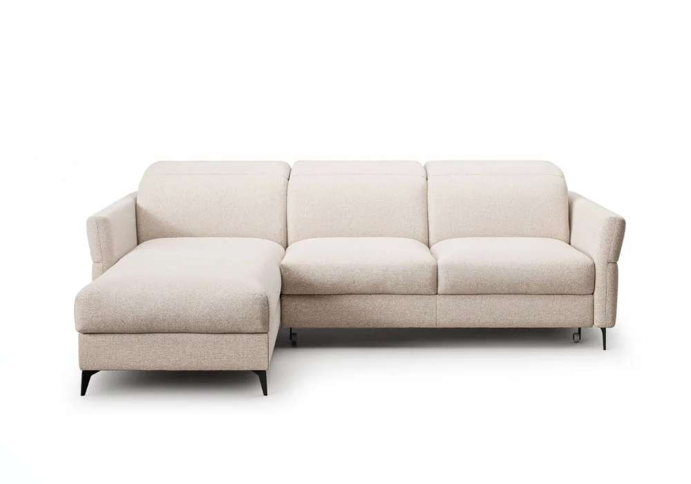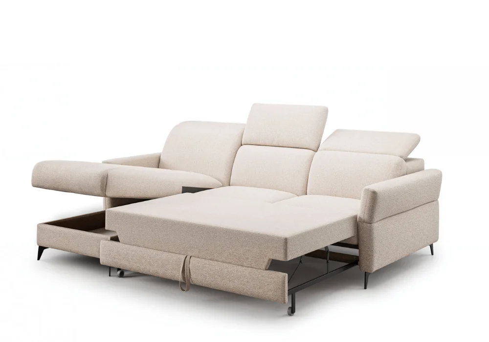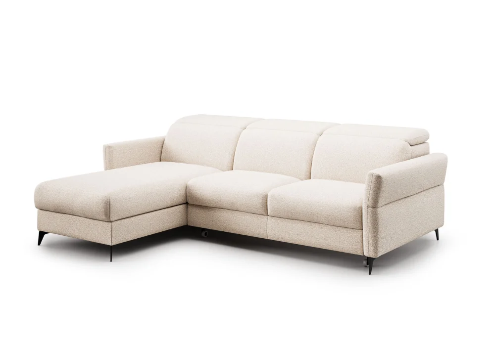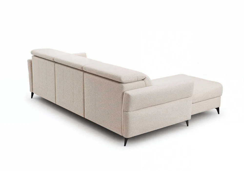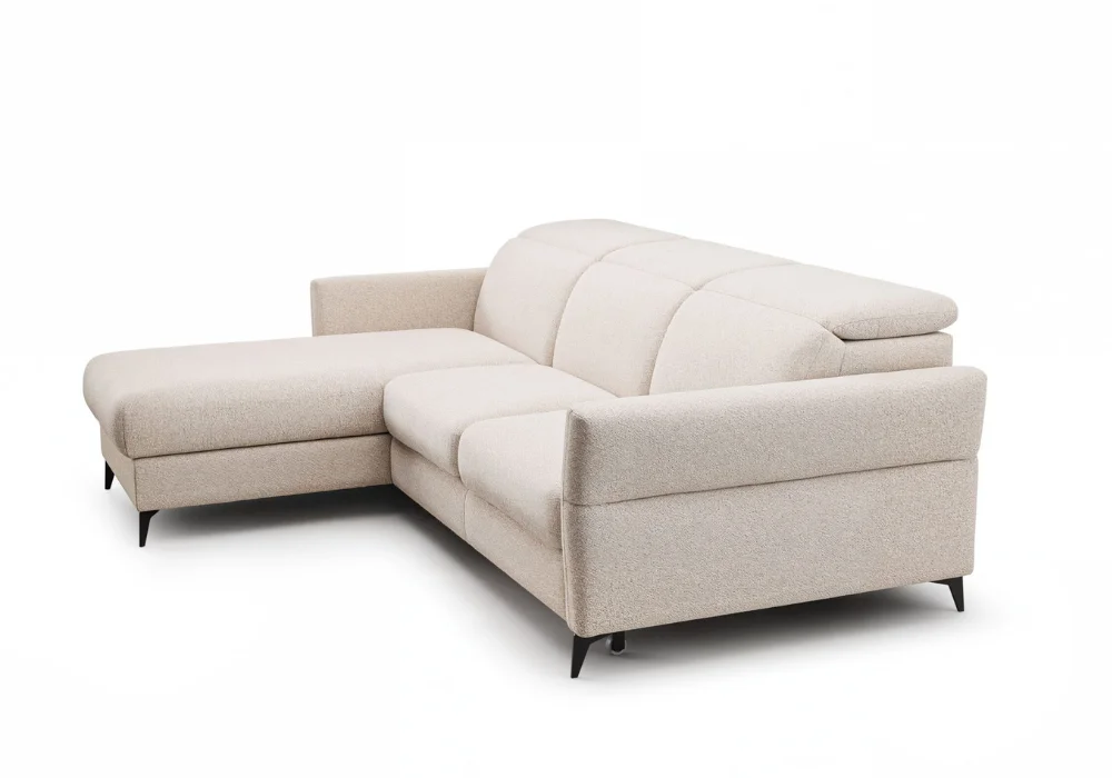 Wypełnienie z wysokoelastycznej pianki, wkładu silikonowego oraz pianki poliuretanowej zapewnia sprężystość, stabilne podparcie i trwałość na lata. Narożnik dostępny jest w szerokiej gamie tkanin i skór naturalnych, co pozwala dopasować go do charakteru wnętrza, od nowoczesnych po bardziej eleganckie aranżacje.