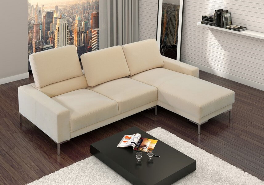 Narożnik Tender o nowoczesnym wyglądzie, tapicerowany w tkaninie lub skórze. Nowoczesny charakter nadają regulowane oparcia oraz metalowe nóżki. Wnętrza siedziska to wysokiej jakości pianka wysokoelatyczna i sprężyna falista.