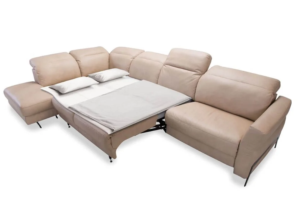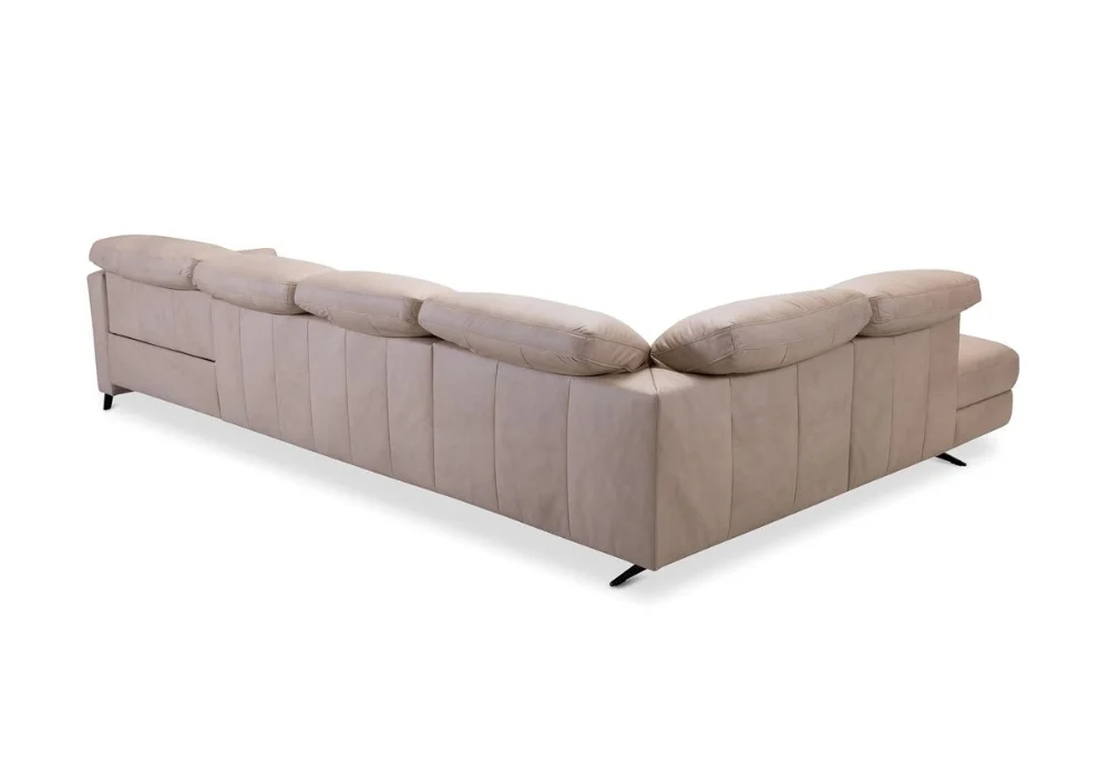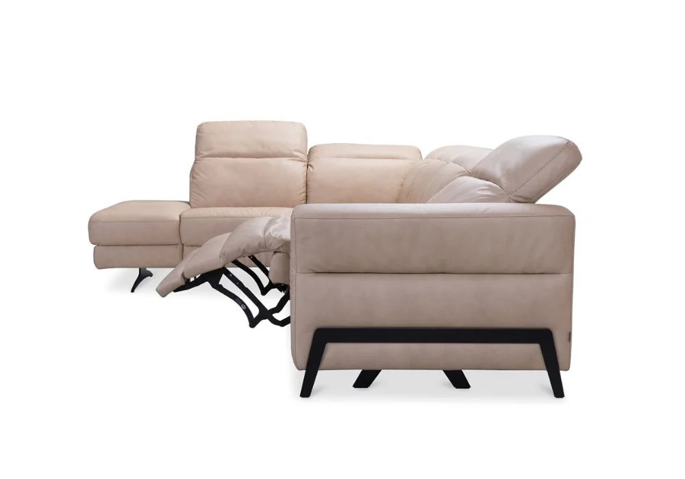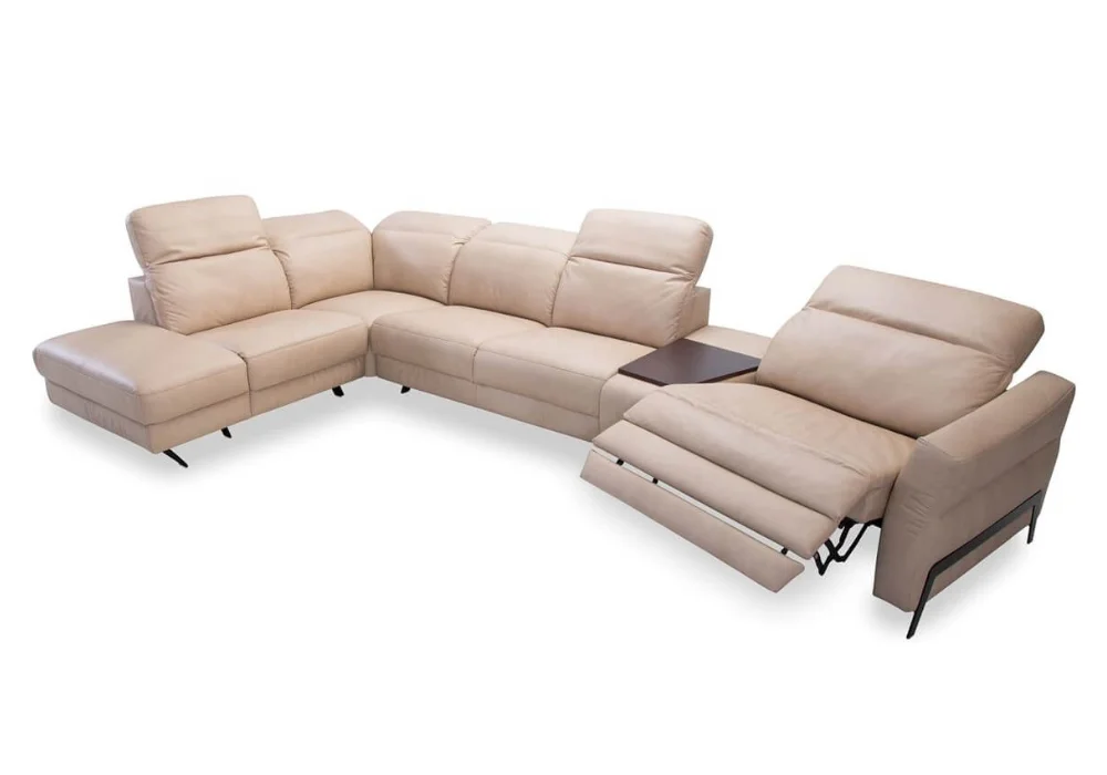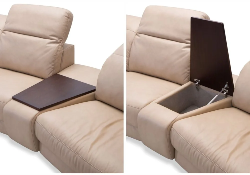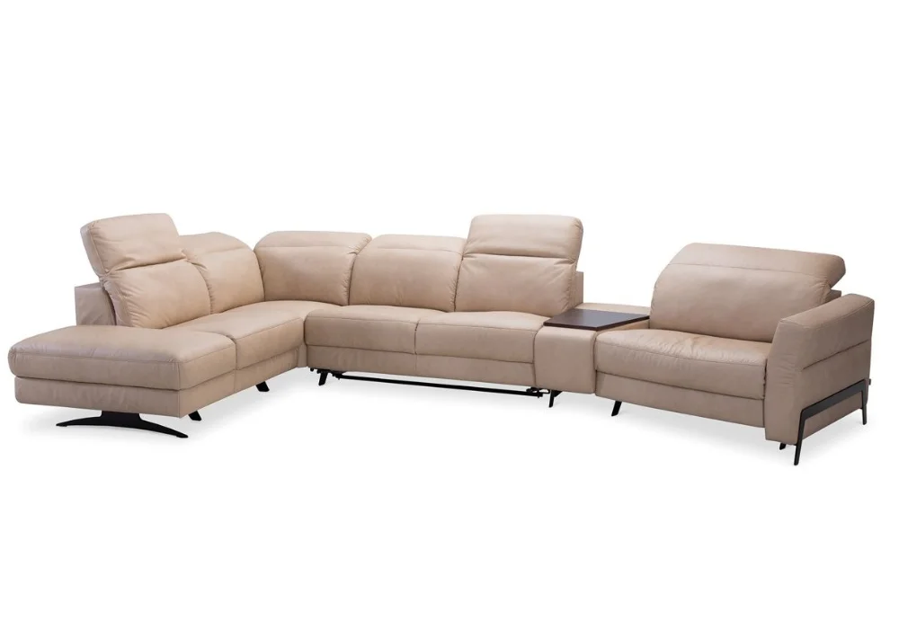 Dzięki systemowi modułowemu możesz zbudować dokładnie taki układ, jakiego potrzebujesz – od kompaktowej sofy, przez klasyczny narożnik w kształcie L, po duży, rodzinny zestaw do wspólnego odpoczynku. Do wyboru są siedziska z elektryczną funkcją relaks, dostępne w trzech szerokościach 70, 80 i 90 cm, co pozwala precyzyjnie dopasować komfort do własnych preferencji. Dodatkowo narożnik można wyposażyć w funkcję spania typu B-Leopard, pojemnik na pościel oraz barek ze schowkiem i drewnianym blatem.