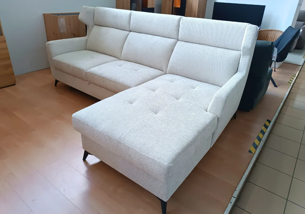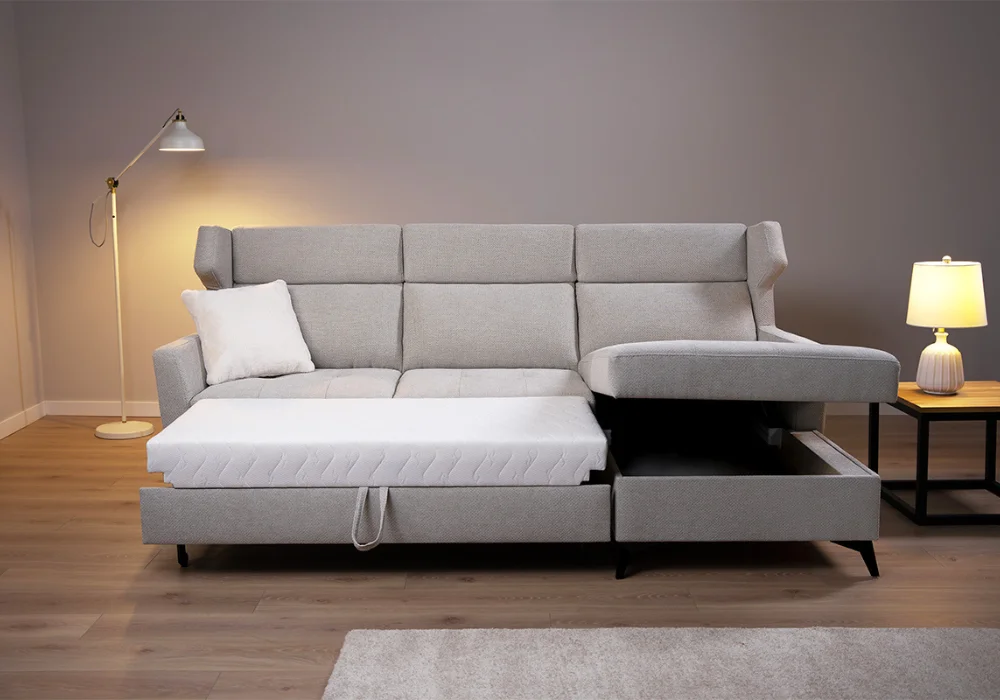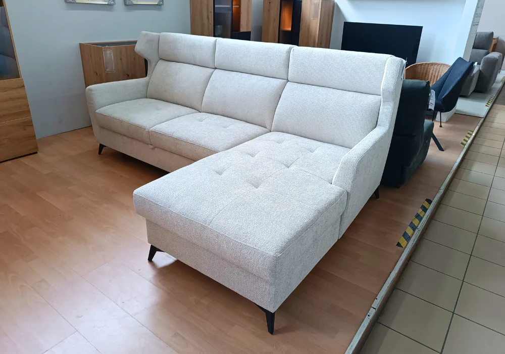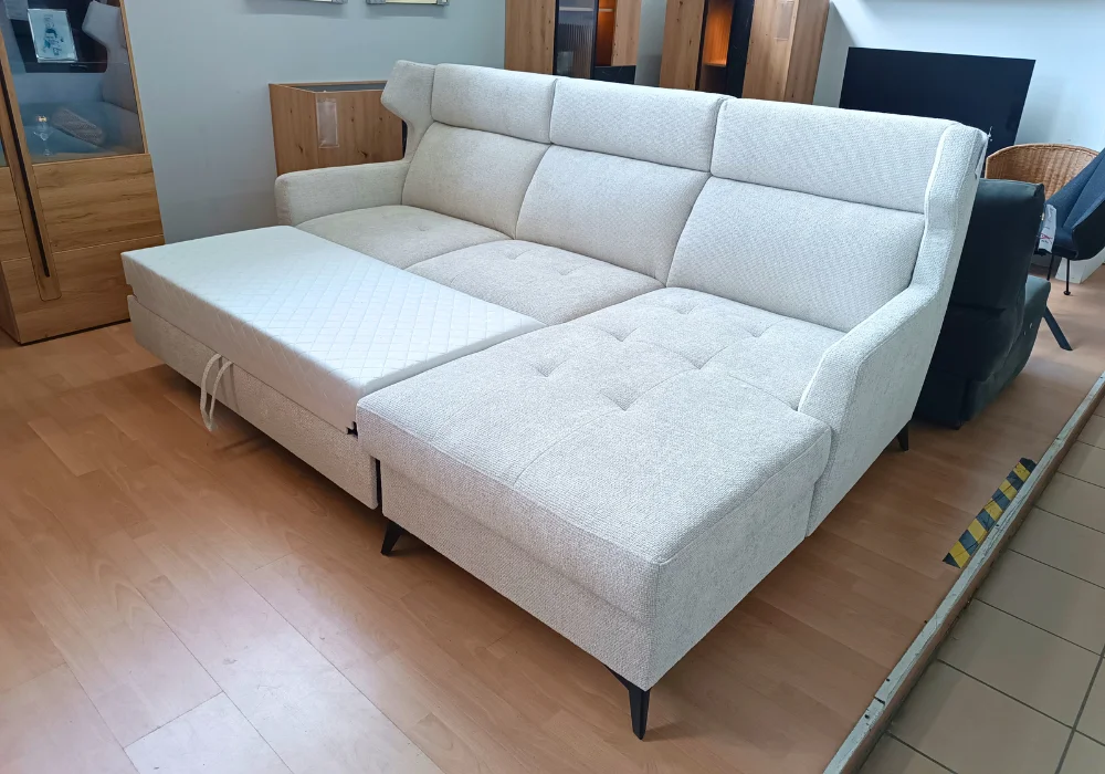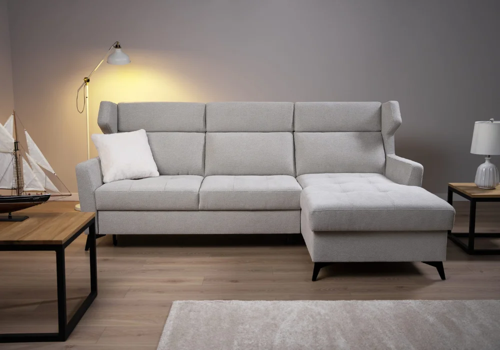 Dzięki funkcji spania, narożnik sprawdzi się także jako miejsce do noclegu – po rozłożeniu oferuje powierzchnię spania o wymiarach 220 x 120 cm. Dodatkowym atutem jest pojemnik na pościel, który ułatwia przechowywanie i pomaga utrzymać porządek w salonie.