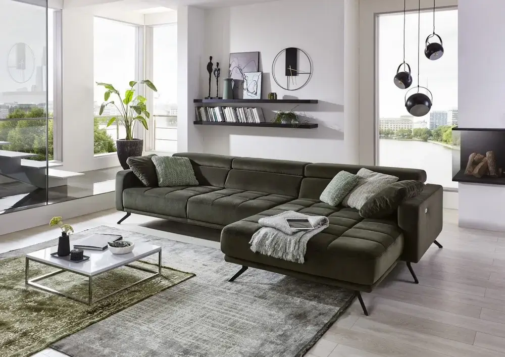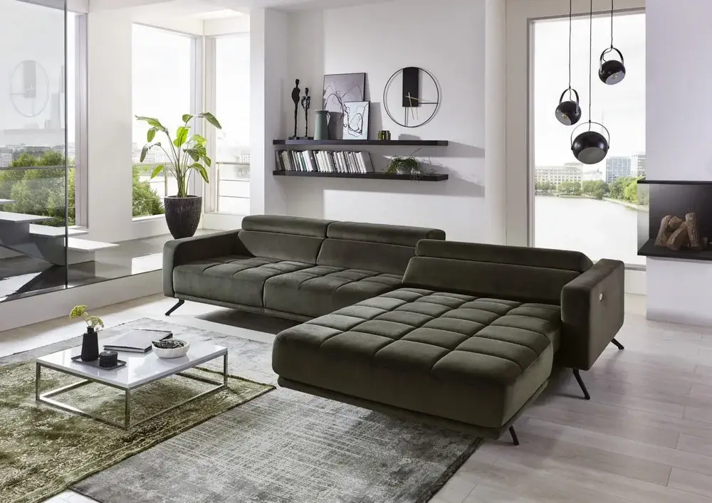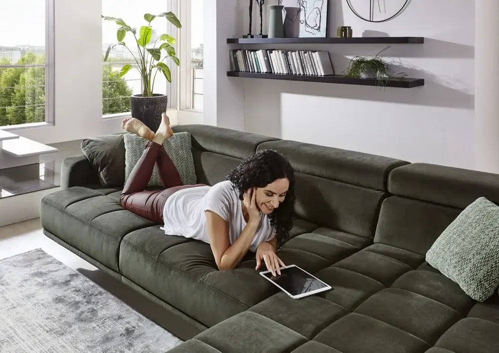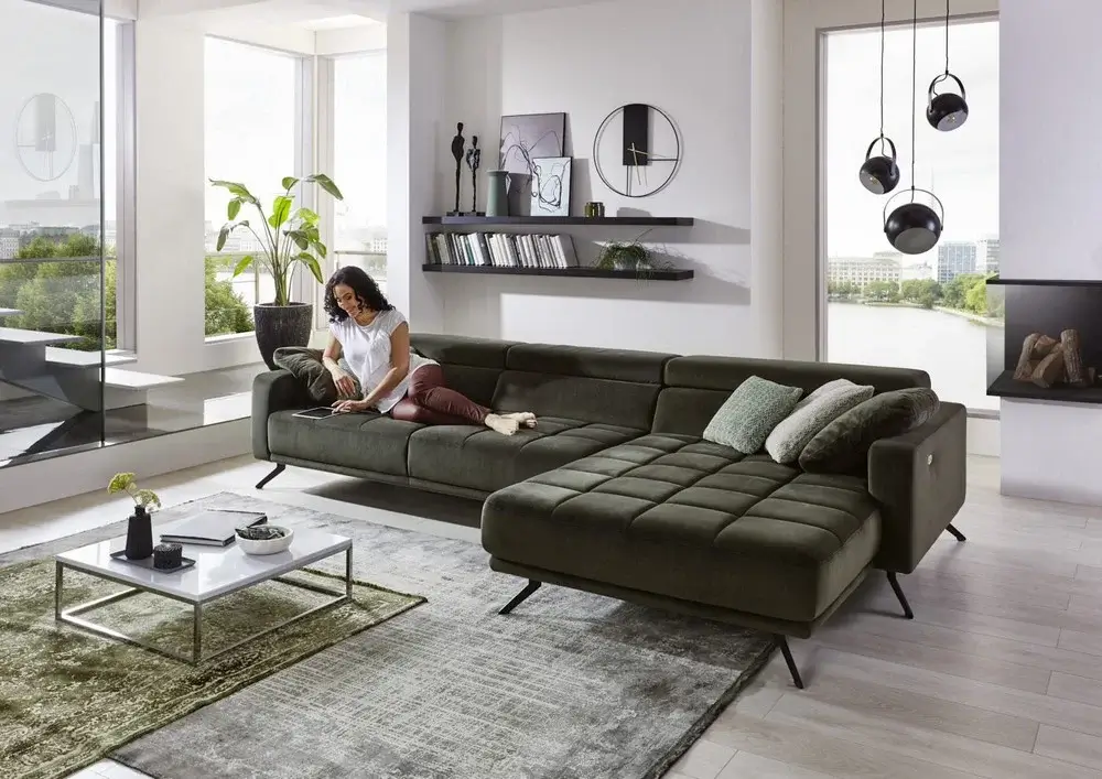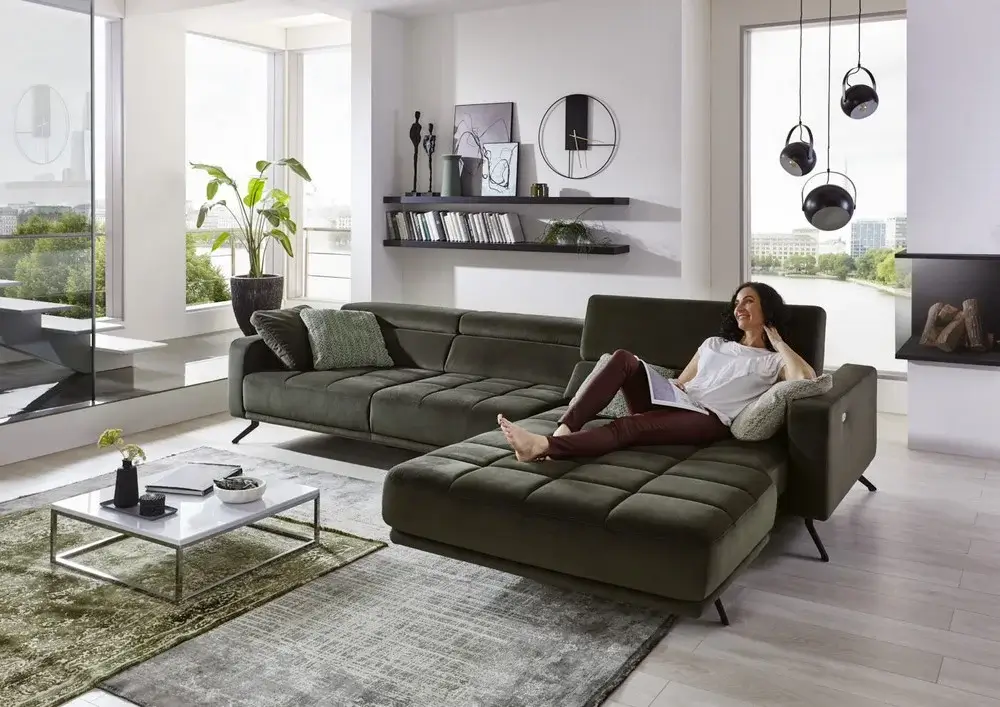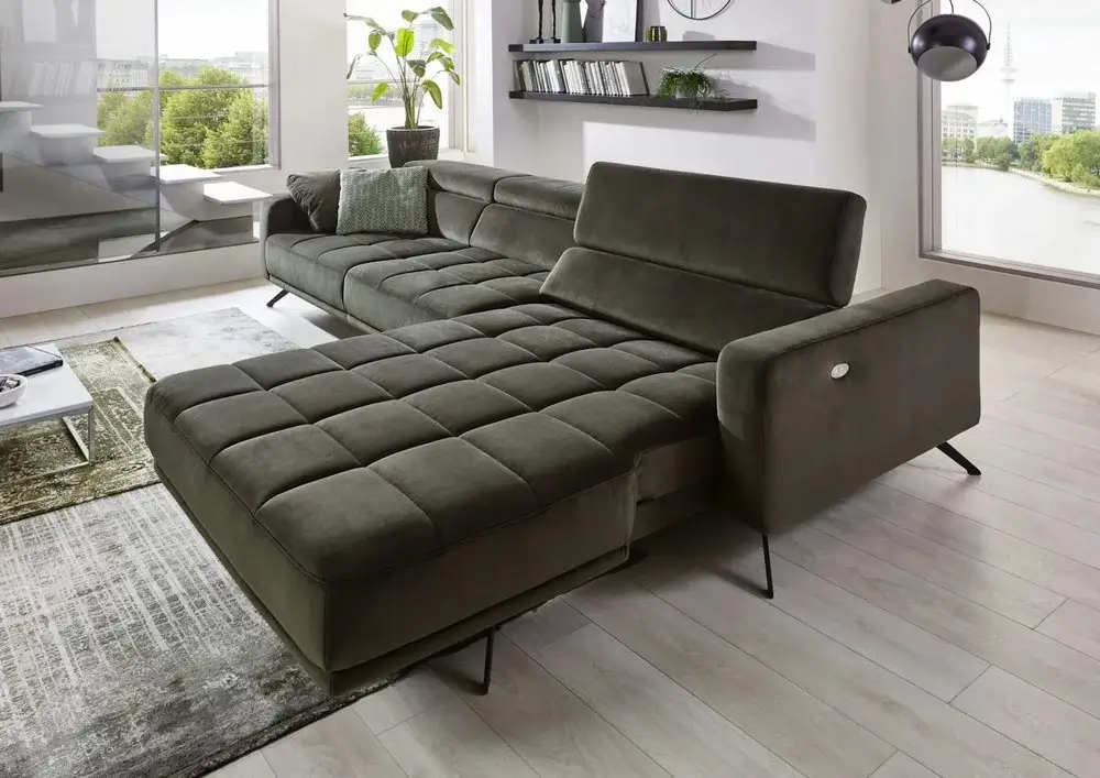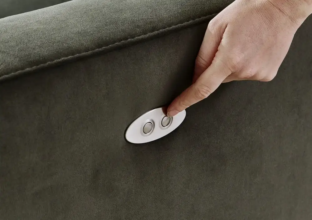 Siedzisko zostało wyposażone w funkcję elektrycznego wysuwu, dzięki której można zwiększyć jego głębokość o około 19 cm. To rozwiązanie sprawia, że narożnik zapewnia jeszcze większą przestrzeń do wypoczynku – zarówno w pozycji siedzącej, jak i leżącej.