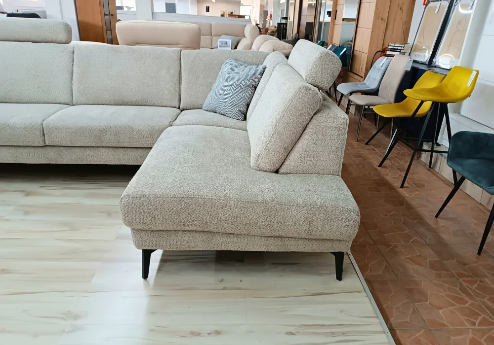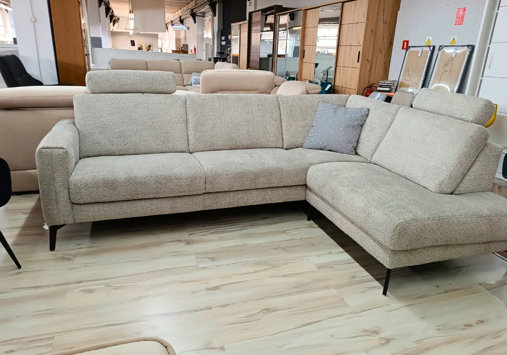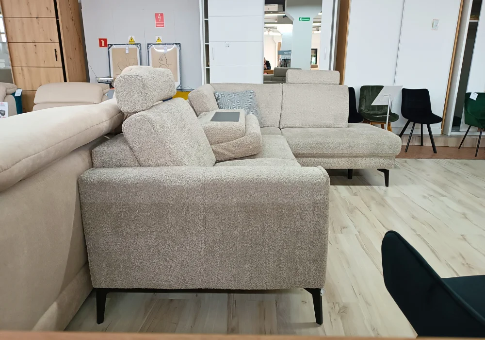 Model ten wyróżnia się czarnymi, wysokimi metalowymi nogami, które dodają konstrukcji lekkości i elegancji, a jednocześnie ułatwiają utrzymanie porządku pod meblem – również przy użyciu robota sprzątającego. Komfortowe, szerokie siedziska umieszczone są na wysokości 48 cm, co zapewnia wygodę zarówno podczas codziennego relaksu, jak i spotkań z bliskimi.