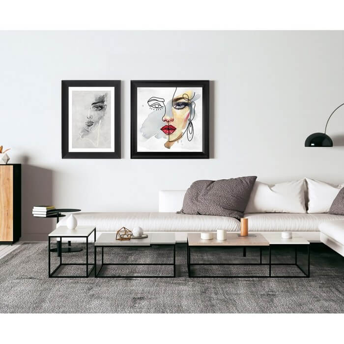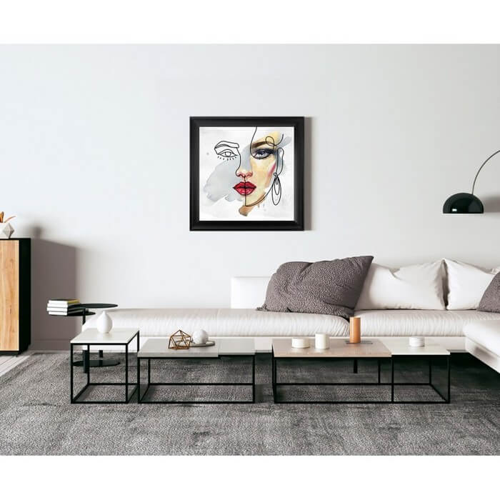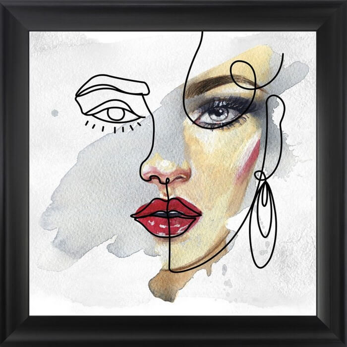 W centrum obrazu widoczna część twarzy na białym tle, będzie idealnym elementem dekoracyjnym salonu lub pokoju młodzieżowego. Obraz w czarnej matowej ramie o profilu zbliżonym do kształtu fal.