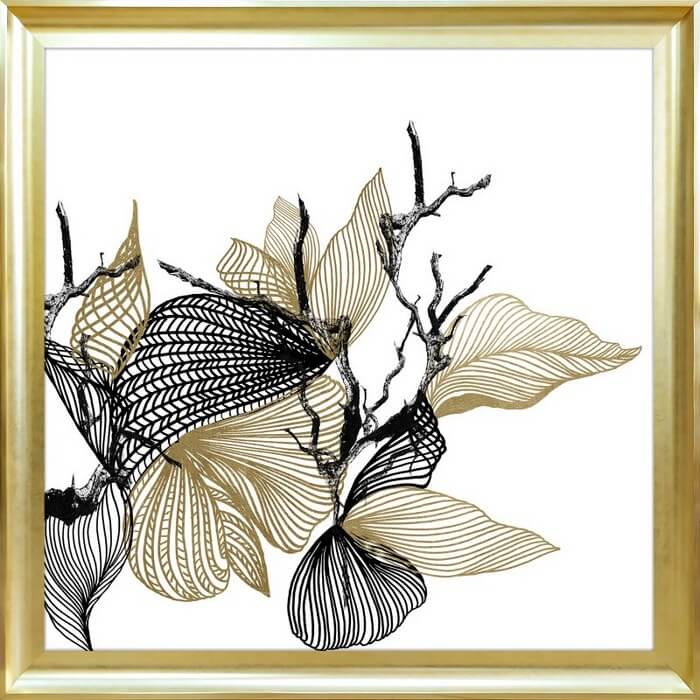 Obraz Linear Twigs No.2 abstrakcja z liśćmi, prezentuje gałązkę z listkami za pomocą kresek, w efektownej ramie w kolorze złotym o profilu wklęsłym.