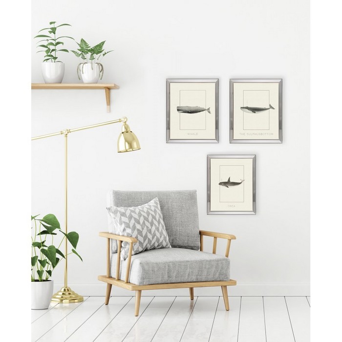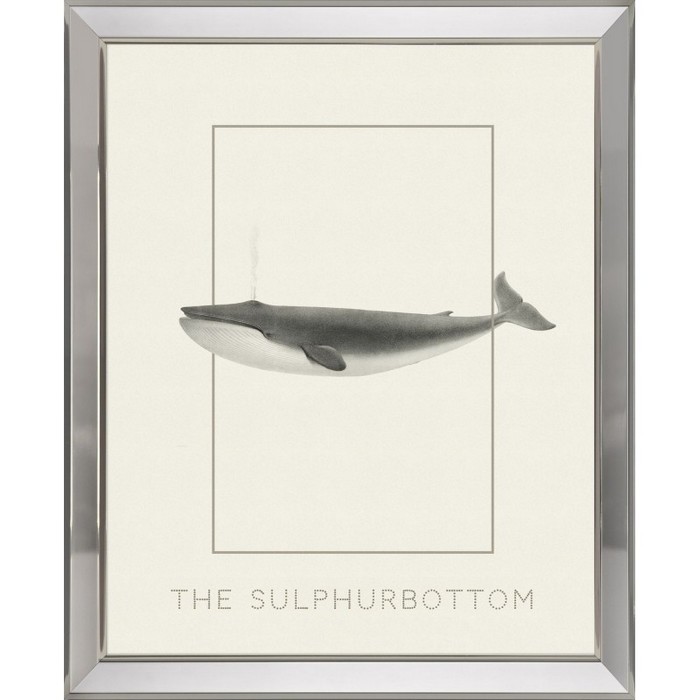 Grafika z dużym wielorybem w kolorze sepii, wewnątrz grafiki widoczna prostokątna ramka. Idealnie będzie się prezentować w salonie, biurze czy w kawiarni. Oprawiona w ramę lustrzaną (z płaszczyzną nachyloną w stronę grafiki) o szer. 3,2 cm i wys. 3 cm.