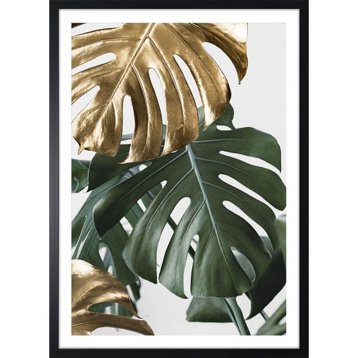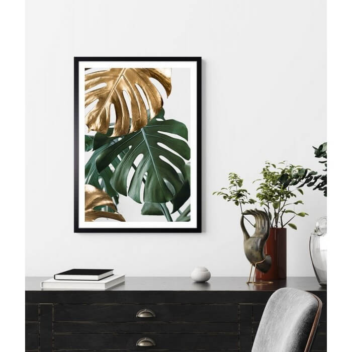 W centrum obrazu dwa, duże liście filodendrona w kolorze złotym i zielonym, obraz osadzony w czarnej matowej ramie o szer. 2 cm i wys. 3,5 cm.