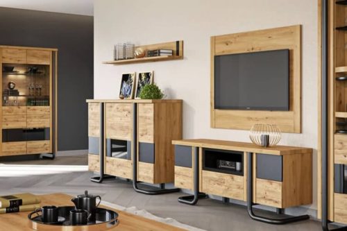 OMEGA to nowoczesne meble do jadalni lub salonu, dla wszystkich ceniącym styl industrialny we wnętrzach. Fronty brył wykonano z drewna dąb dziki z widocznionym usłojeniem a korpusy w okleinie naturalnej.