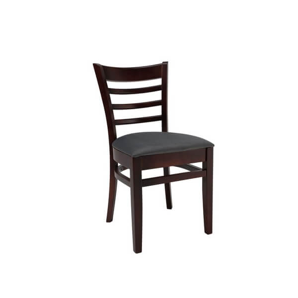 Eleganckie krzesło z tapicerowanym siedziskiem i poziomymi szczebelkami w ramie oparcia, wykonane ze drewna bukowego.