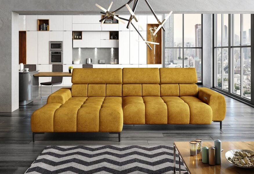 Plaza Mini to komfortowy narożnik z elektrycznie regulowaną głębokością siedziska oraz funkcję regulacji zagłówków, które umożliwiają przyjęcie najbardziej komfortowej pozycji ciała w czasie wypoczynku.