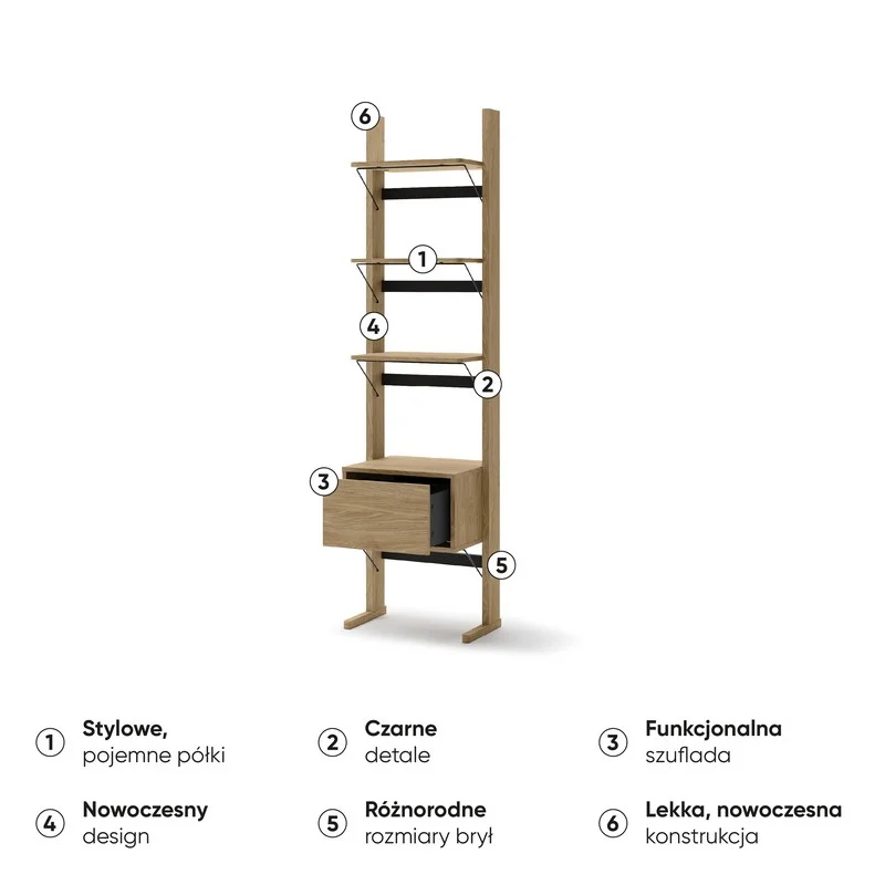 Wyposażony w pięć półek oraz pojemną szufladę z systemem push-open, regał zapewnia wygodę użytkowania i estetyczny wygląd bez zbędnych uchwytów. Naturalna kolorystyka dębu olejowanego nadaje mu ciepły i elegancki charakter, doskonale pasujący do nowoczesnych, skandynawskich i klasycznych wnętrz.