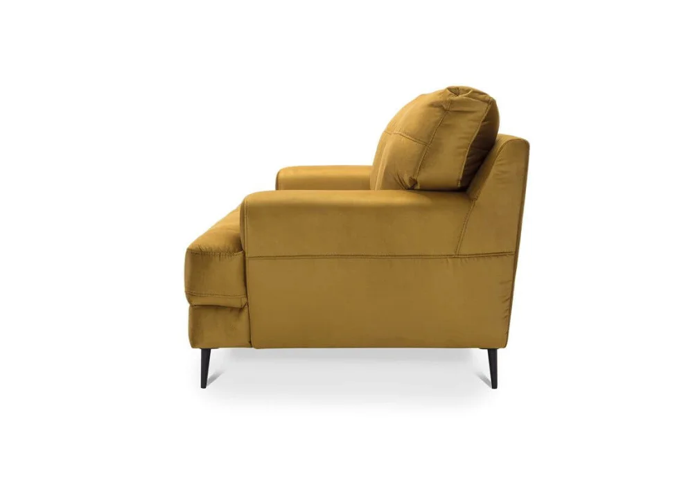 Charakterystyczne szerokie podłokietniki oraz wysokie, czarne metalowe nóżki nadają meblowi wizualnej lekkości, jednocześnie stabilizując jego solidną konstrukcję.