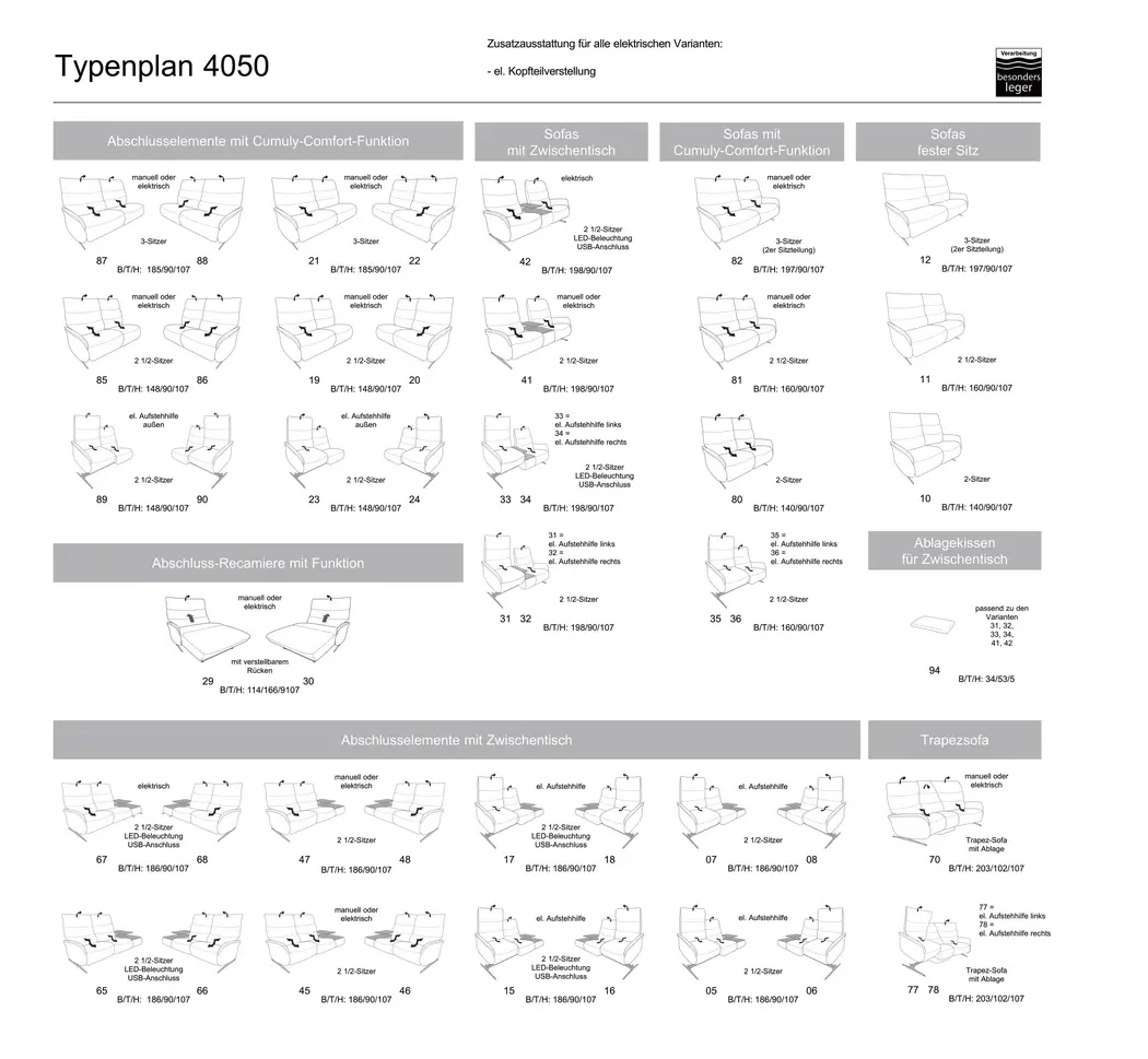 Sofę można ustawić w pozycji spoczynkowej ręcznie lub elektrycznie za pomocą przełącznika umieszczonego z boku siedziska. Umożliwia ona osobną regulację podnóżka, oparcia oraz zagłówka, a także można ją wyposażyć w elektrycznie sterowany mechanizm wspomagania w wstawaniu. Model trapezowy posiada składane oparcie środkowe, które w kilka chwil można przekształcić w stolik do przechowywania. Sofa może być również wyposażona w zewnętrzny akumulator dostępny w kolorze srebrnym lub antracytowym.