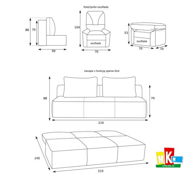 Prosta i geometryczna forma, polecana do niewielkiego pokoju. Posiada solidne siedzisko z dwoma poduchami które stanowią również rolę dekoracyjną. Sofa Feldo posiada funkcję spania z pojemnikiem na pościel.