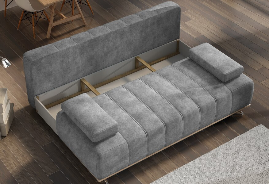 szer. 206 cm, gł. 102 cm, wys. 77-87 cm, wys. siedziska 47 cm, pow. spania 144×200 cm, pojemnik na pościel 177x62x24 cm