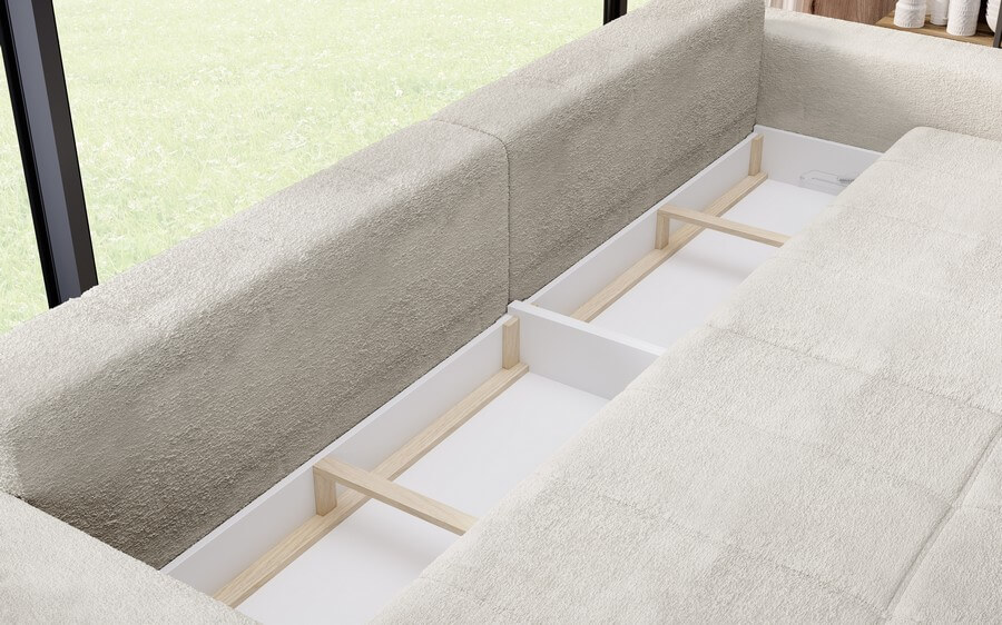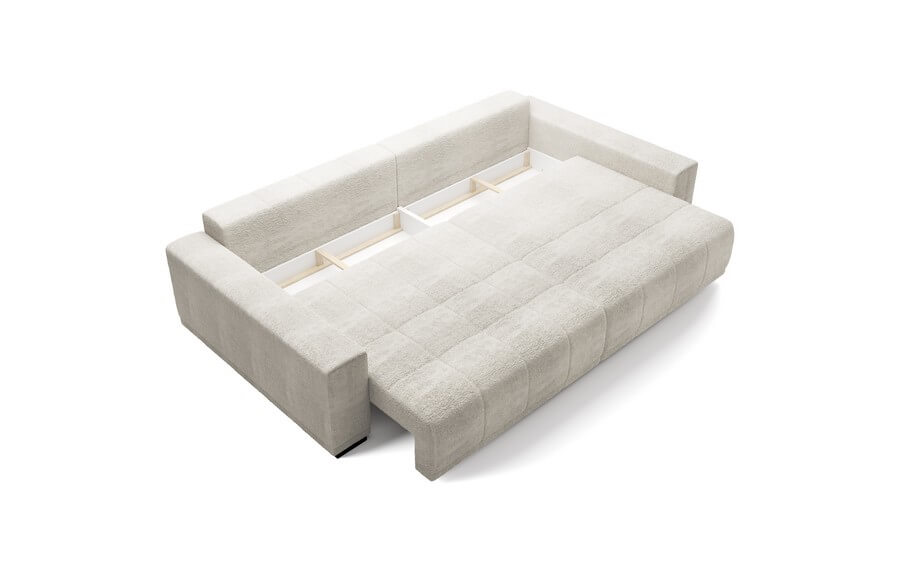 szer. 288 cm, gł. 143 cm, wys. 71-89 cm, wys. siedziska 45 cm, pow. spania 184×238 cm, 2 pojemniki na pościel 114x77x17 cm