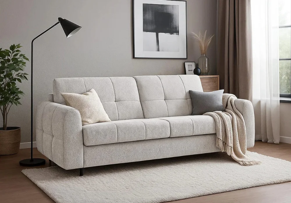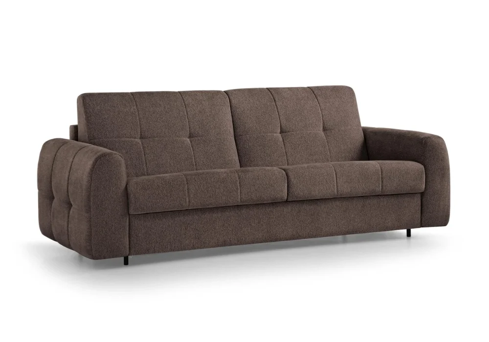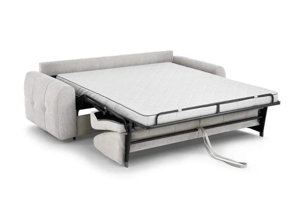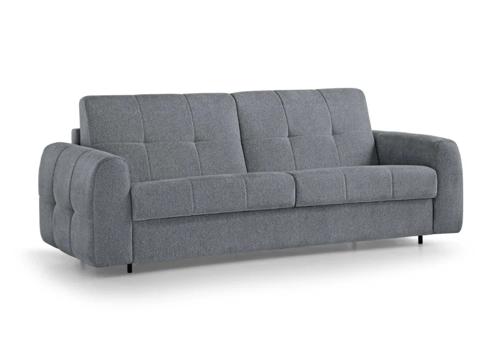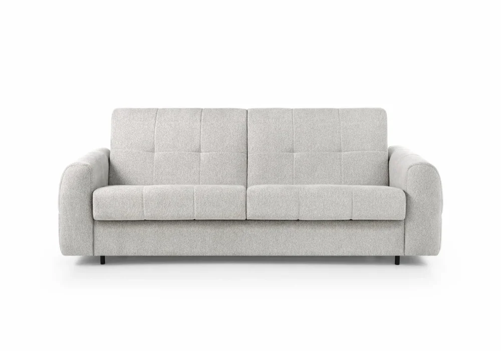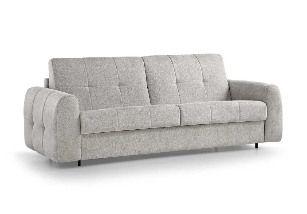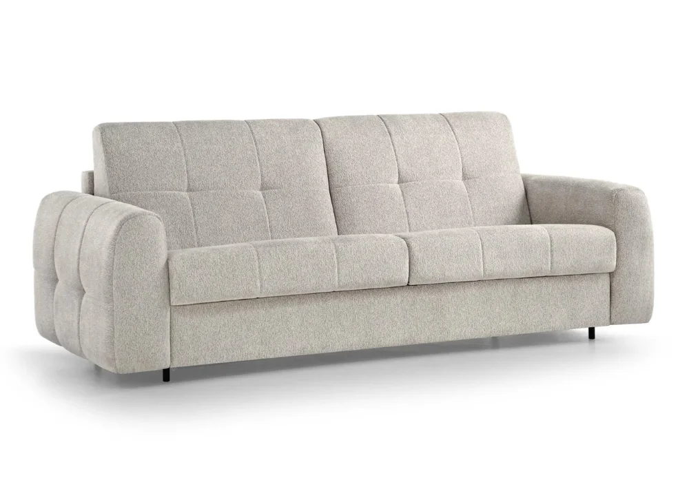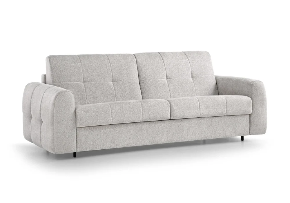 Sofa Peroni 230 cm to elegancki i funkcjonalny mebel, który w dzień pełni rolę komfortowej kanapy, a nocą zamienia się w wygodne łóżko. Mechanizm typu włoskiego umożliwia szybkie rozłożenie metalowego stelaża z ukrytym materacem, dzięki czemu zyskujesz równą i stabilną powierzchnię snu o wymiarach 160 × 195 cm, bez konieczności zdejmowania poduszek oparciowych.