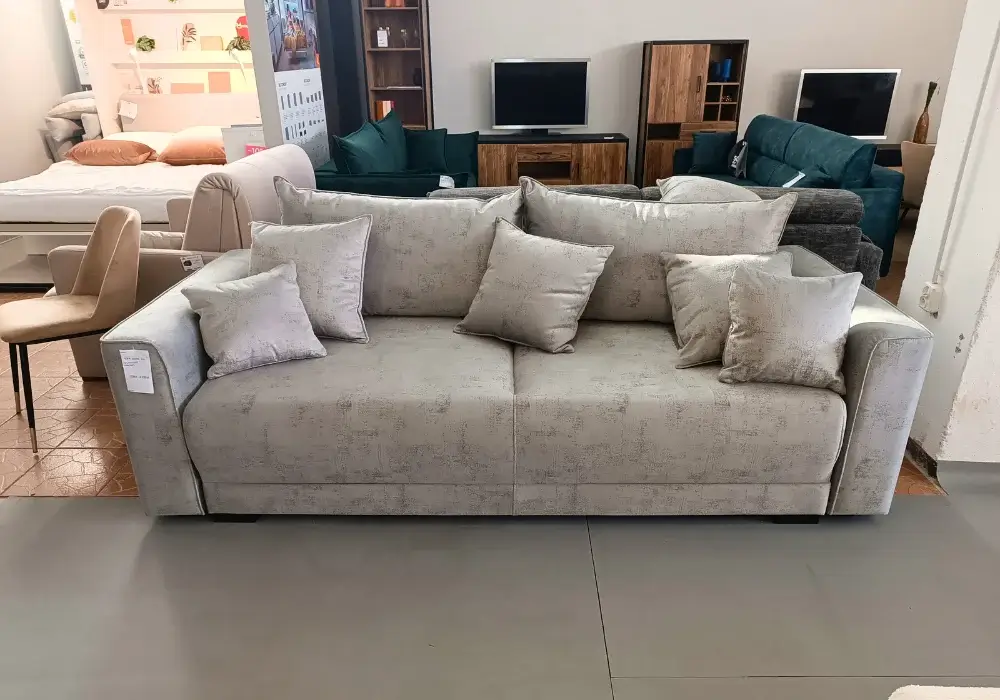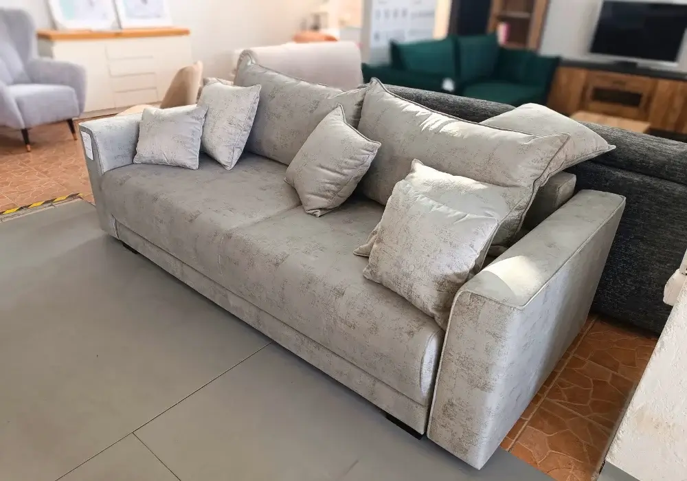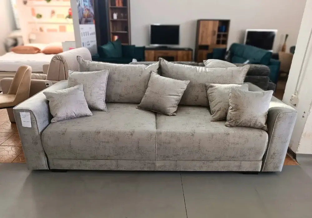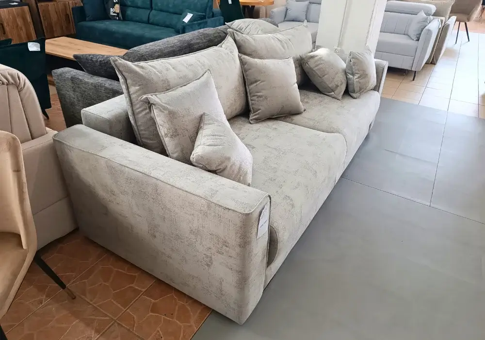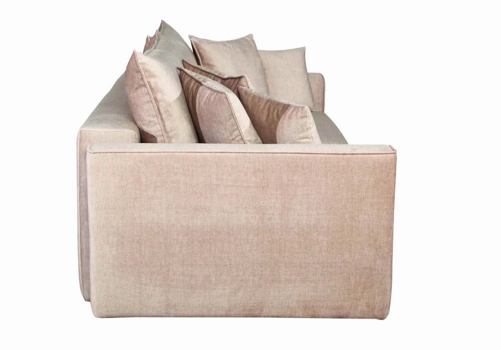 Sofa Siesta to elegancki i przestronny mebel, który doskonale wpisuje się w nowoczesne wnętrza. Dzięki dwóm poduszkom oparciowym i sześciu dekoracyjnym poduszkom wnosi do pomieszczenia ciepło i przytulność. Wypełnienie z kulek silikonowych sprawia, że poduszki idealnie dopasowują się do ciała, zapewniając wyjątkowy komfort podczas odpoczynku.