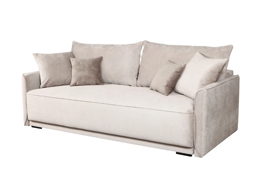 W siedzisku oraz w całej powierzchni spania zastosowano sprężynę falistą i piankę wysokoelastyczną, co gwarantuje odpowiednią sprężystość i trwałość użytkowania. Sofa wyposażona jest w funkcję spania z automatycznym systemem rozkładania oraz praktyczny pojemnik na pościel, który ułatwia utrzymanie porządku w salonie.