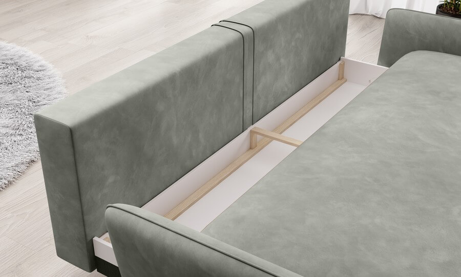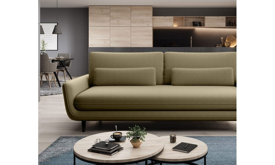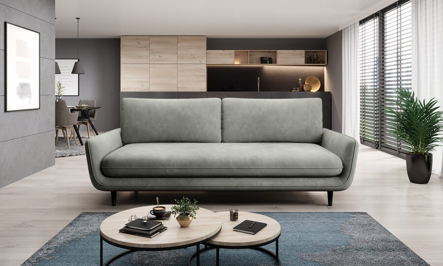 Praktyczne podejście do projektowania mebla objawia się również w obszernym pojemniku znajdującym się pod siedziskiem sofy. Ten dodatkowy schowek zapewni Ci odpowiednie miejsce do przechowywania. Kolejnym atutem sofy Solano jest możliwość personalizacji. Wybór różnych struktur i kolorów tkanin daje użytkownikowi swobodę w kreowaniu charakteru mebla, idealnie dopasowując go do swoich indywidualnych upodobań i stylu wnętrza.