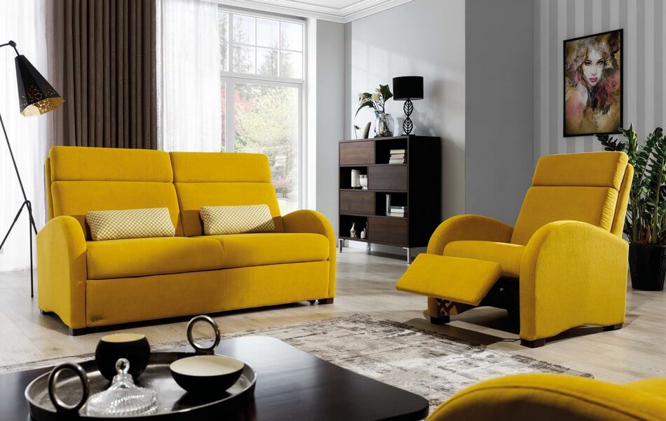 Dodatkowo, sofa posiada funkcję spania a wysoki komfort użytkowania zapewnia  sprężyna falista, listwy sprężynujące oraz pianka HR. Mebel dostępny w bogatej ofercie tkanin obiciowych.