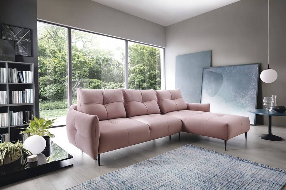 Model wyposażony w funkcję spania typu DL oraz pojemnik na pościel. Całość stoi na metalowych nóżkach, które podkreślają lekkość narożnika. Do wyboru bogata oferta tkanin obiciowych.