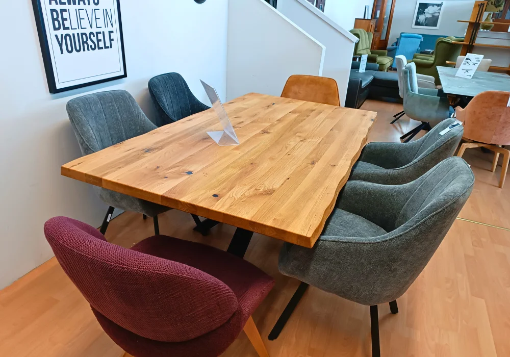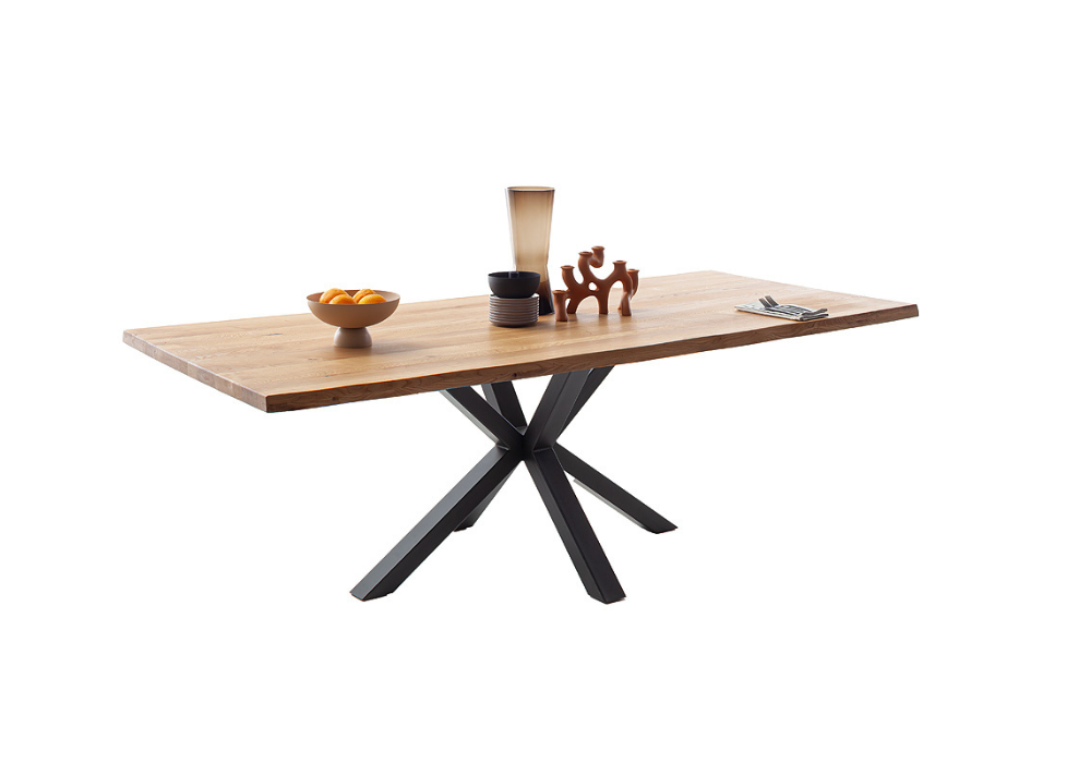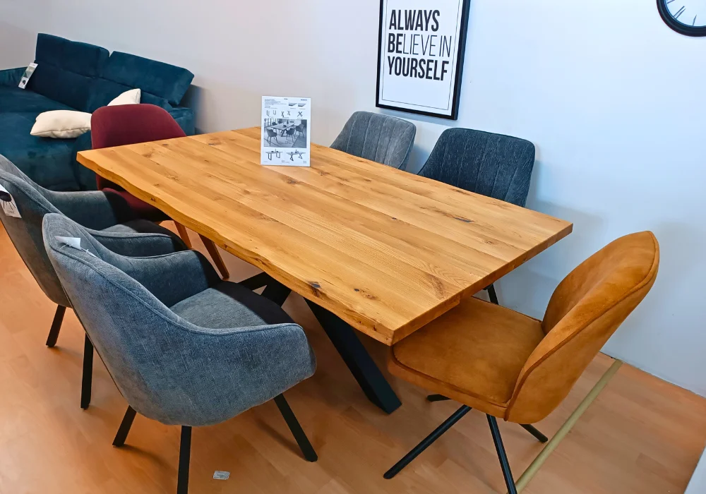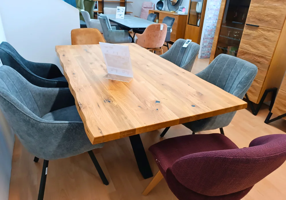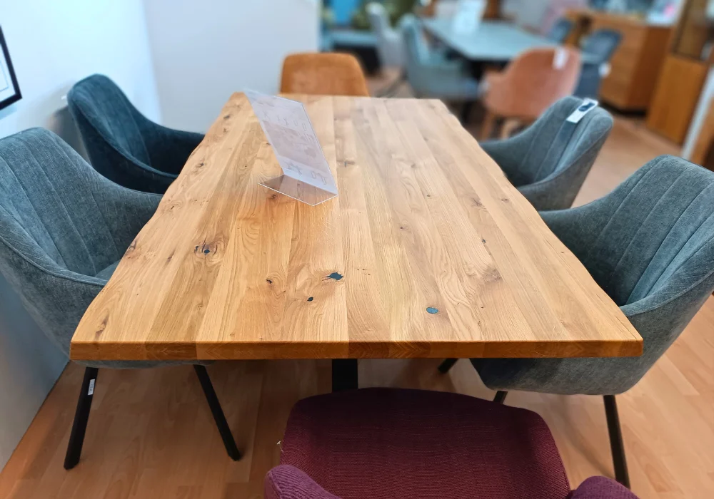 Stół Deba to wyraz wyrazistego stylu i solidnego rzemiosła, zaprojektowany z myślą o nowoczesnych przestrzeniach. Blat wykonany z litego dębu dzikiego zachwyca naturalnym rysunkiem słojów, a jego pogrubiona, 4-centymetrowa krawędź z efektownym, ciosanym wykończeniem podkreśla surowy charakter mebla.