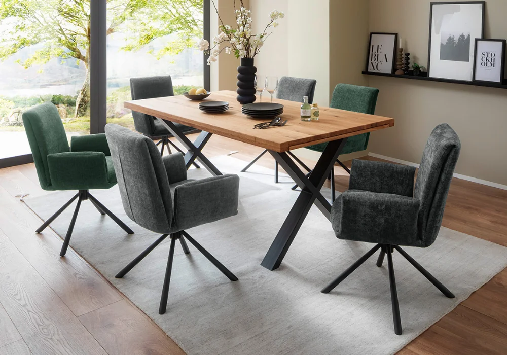 Jego wyjątkowy charakter podkreśla blat wykonany z litego, dzikiego dębu, wykończony naturalnym olejem, który pięknie eksponuje usłojenie drewna i jego niepowtarzalną strukturę. Dzięki temu każdy egzemplarz stołu jest unikatowy i wnosi do wnętrza autentyczne ciepło oraz ponadczasową klasę.