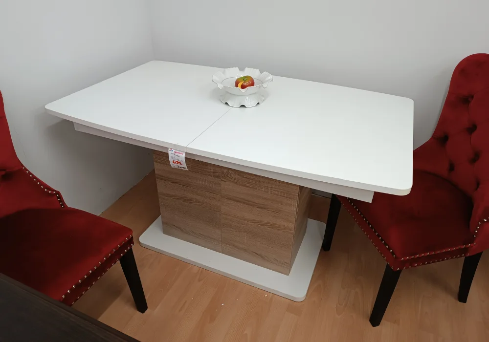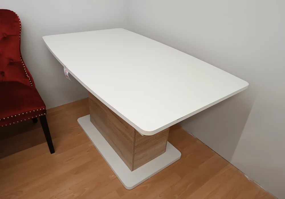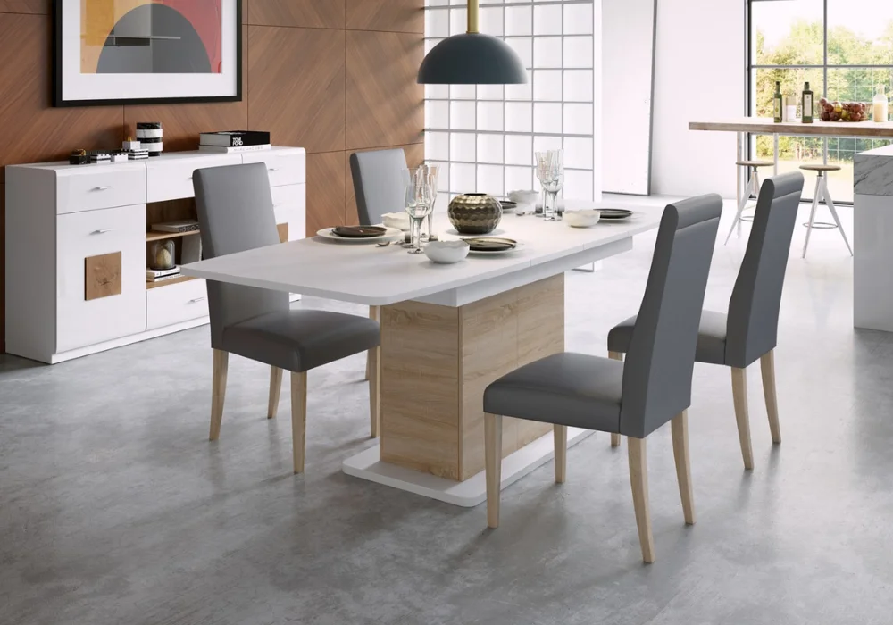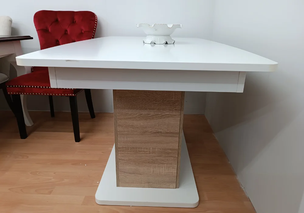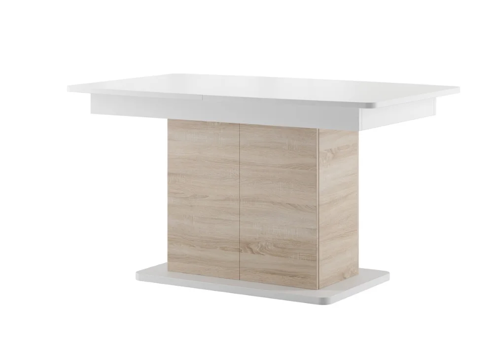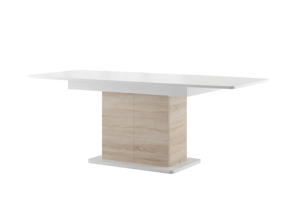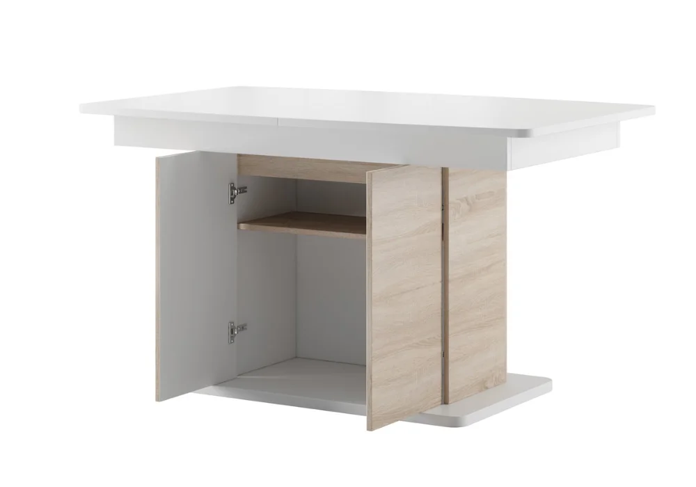 Centralna noga kryje szafkę z półką otwieraną systemem push-to-open – idealną na akcesoria. Wykonany z trwałej płyty laminowanej, stół wyróżnia się eleganckim połączeniem koloru biały mat z dekorem dąb sonoma, pasującym do różnych stylów wnętrz.