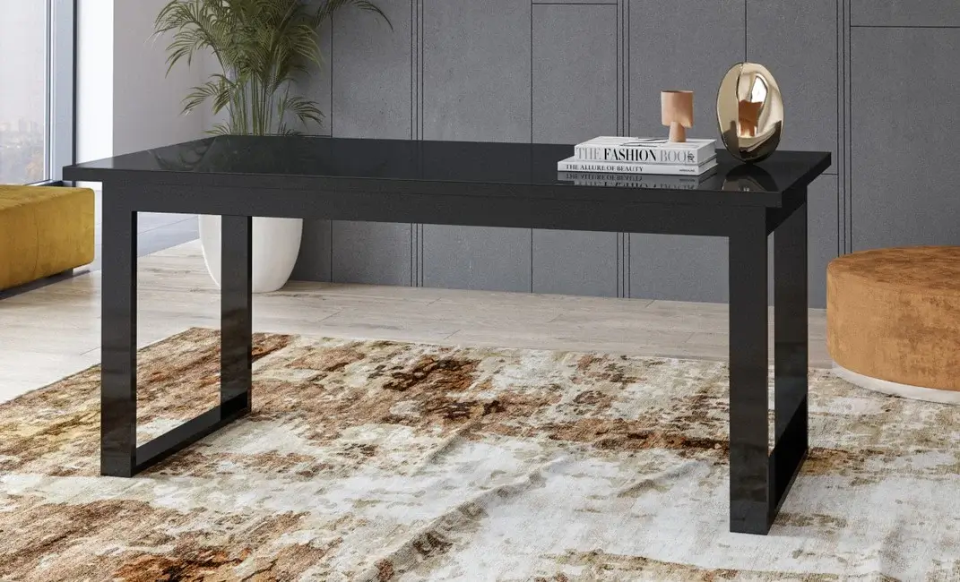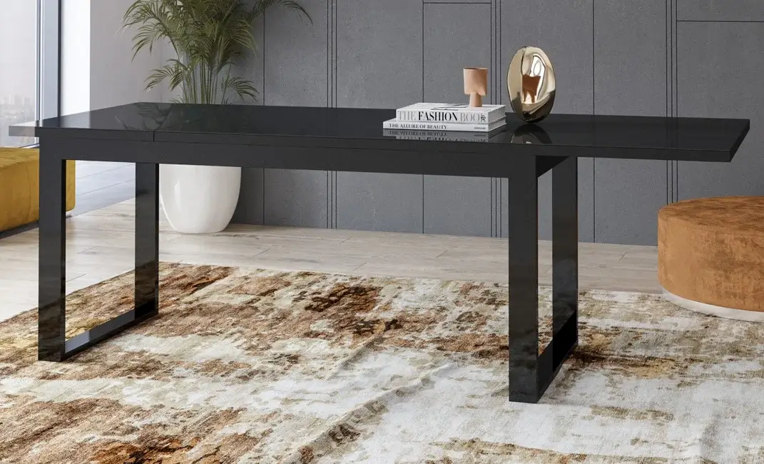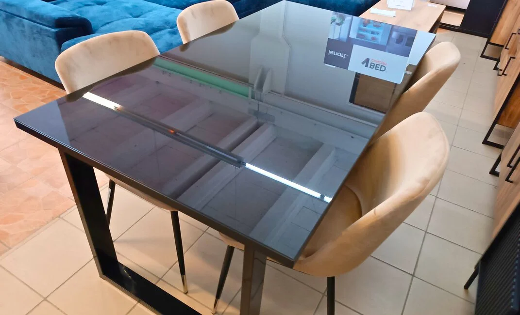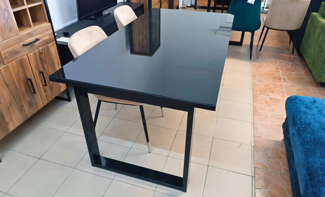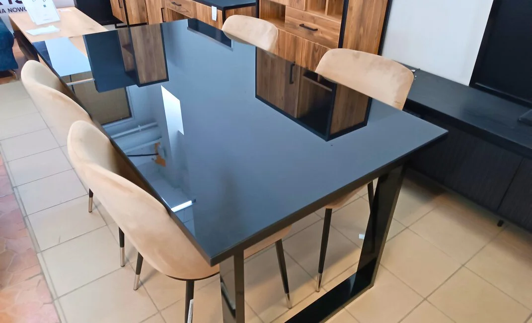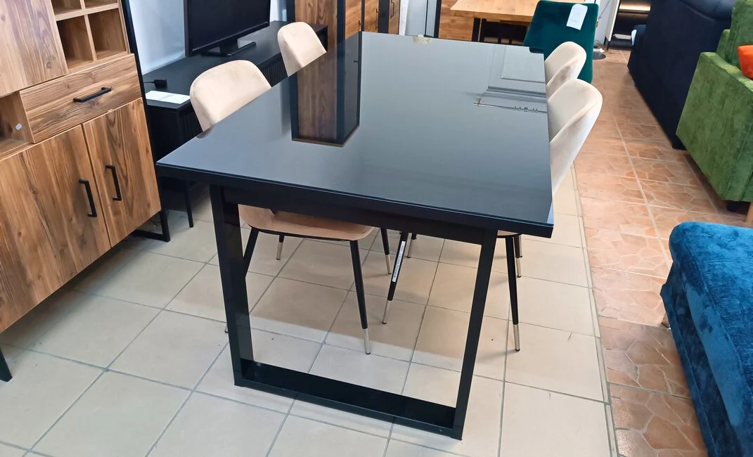 Czarny blat z hartowanego szkła, subtelnie odbijający światło, dodaje mu klasy i sprawia, że stół doskonale wpasowuje się w różnorodne wnętrza, w tym nowoczesne i loftowe. Metalowe nogi zapewniają stabilność, a ich minimalistyczny design uzupełnia całość.