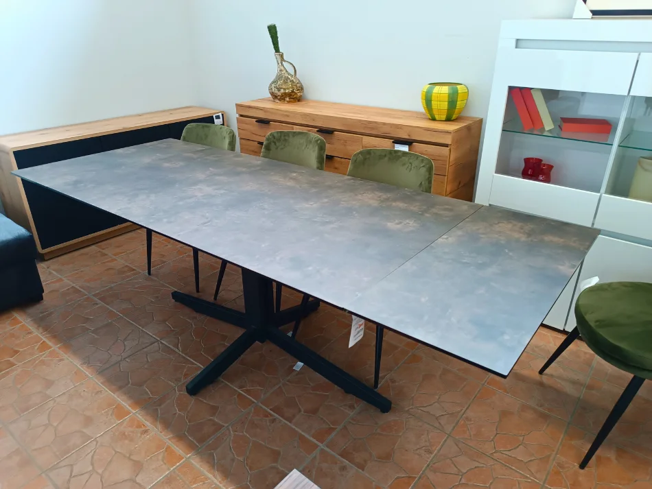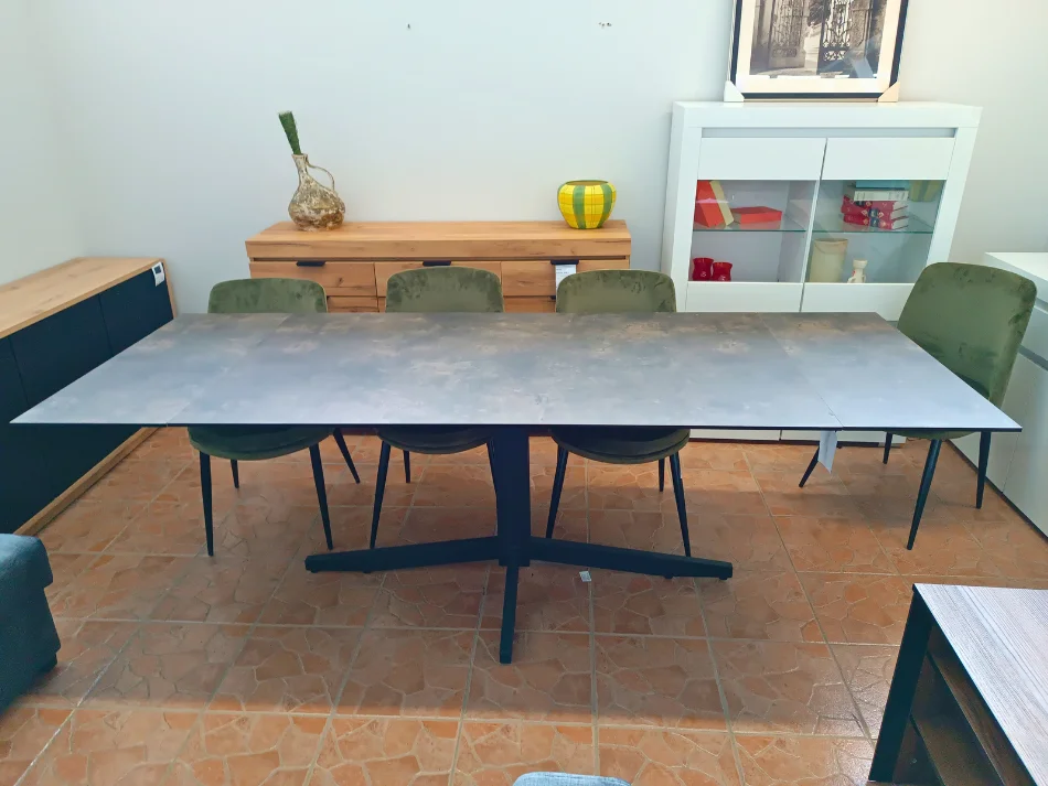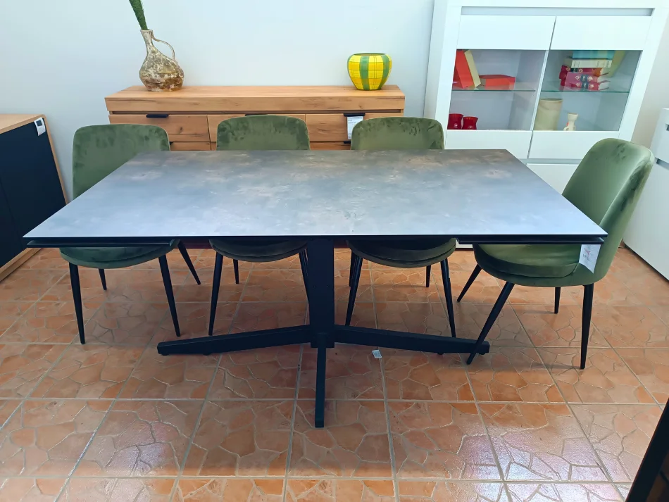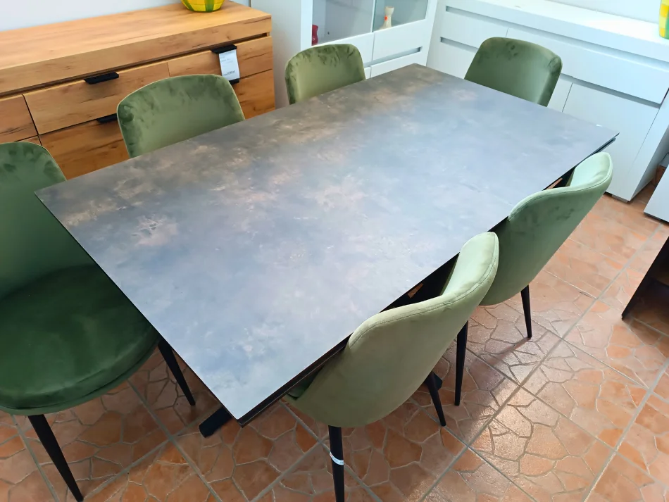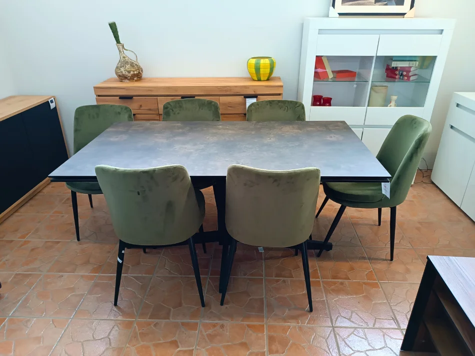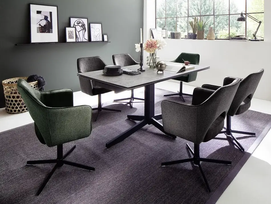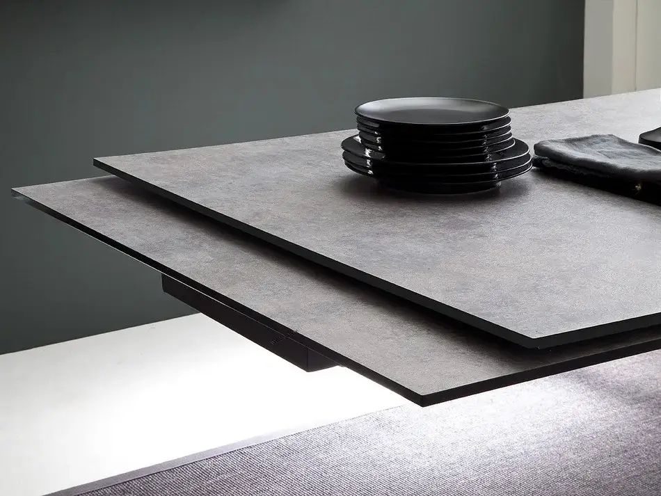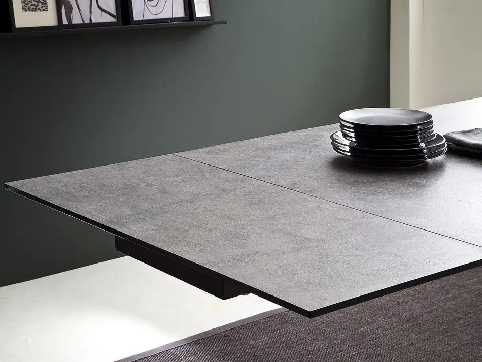 Blat stołu wykonany jest z trwałego szkła bezpiecznego o grubości 10 mm, pokrytego laminatem HPL w optyce kamienia, co nadaje mu elegancki i nowoczesny wygląd. Dzięki tej estetyce, stół doskonale wpisuje się w nowoczesne wnętrza, oferując jednocześnie praktyczne rozwiązania – nawet bez dodatkowych dekoracji wygląda efektownie i stylowo.