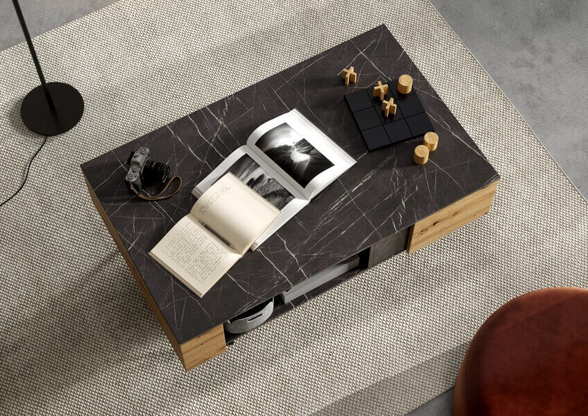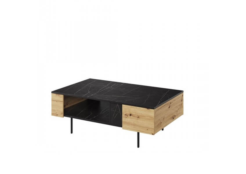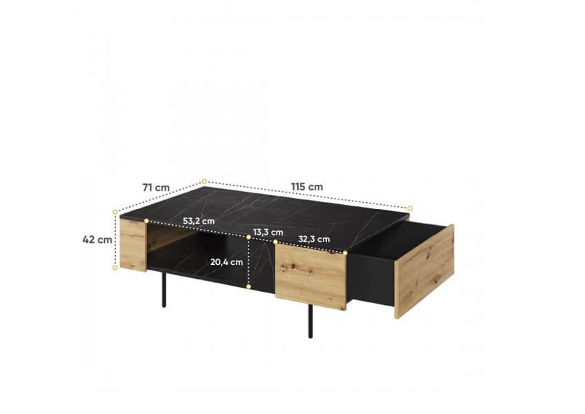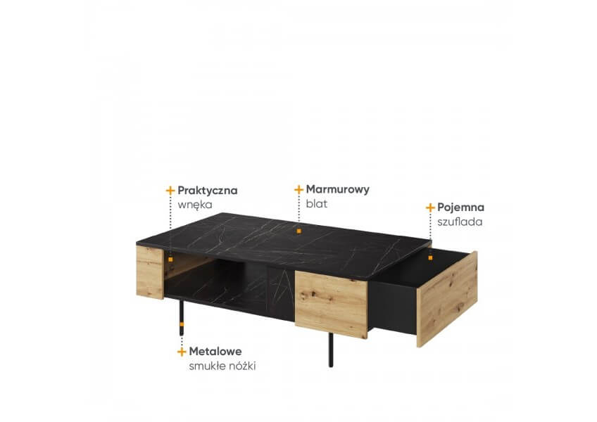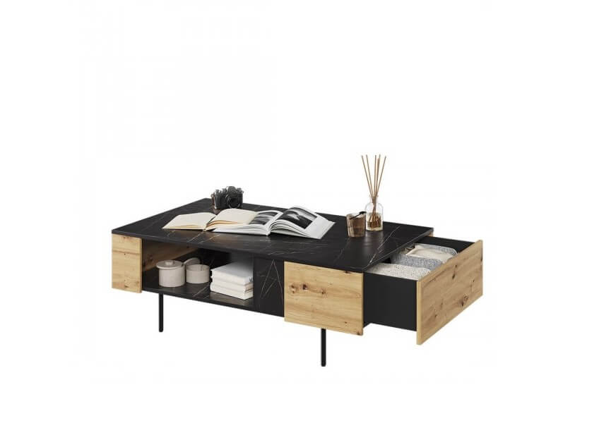 Bezuchwytowy front szuflady podkreśla estetykę i porządek, a system soft close zapewnia łagodne domykanie. Czarny blat o efektownym marmurowym wzorze doskonale współgra z ciepłym drewnianym kolorem. Smukłe metalowe nóżki o delikatnie zaokrąglonych kształtach nadają stolikowi lekkość i elegancję. Projektanci wykorzystali potencjał zarówno otwartych, jak i zamkniętych przestrzeni, co sprawia, że mebel doskonale prezentuje się w salonach o niewielkim metrażu.