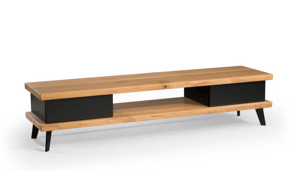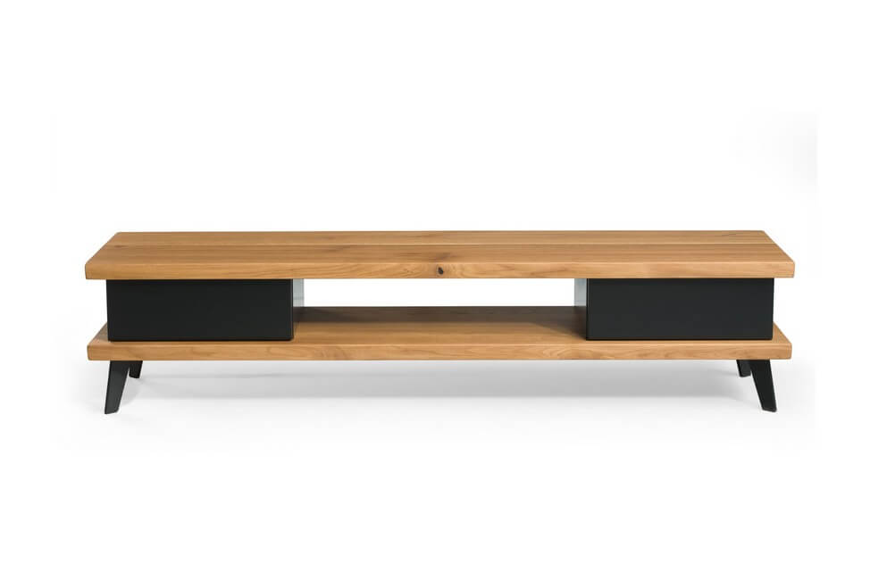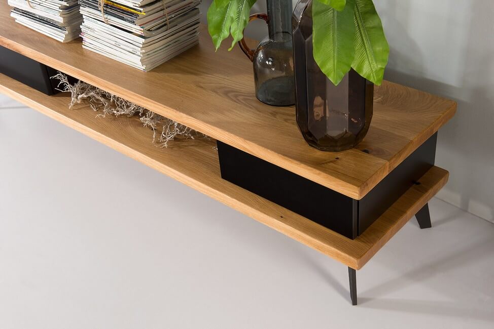 Gustownie wykończony stolik RTV Soho, wykonany z naturalnego dębu o grubości ok. 4 cm. Stolik będzie idealnie korespondować z wnętrzami w industrialnym, bądź loftowym stylu. Blat zabezpieczony woskiem twardym olejnym Original OSMO. Istnieje również możliwość położenia warstwy lakierniczej.
