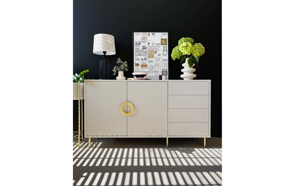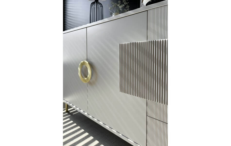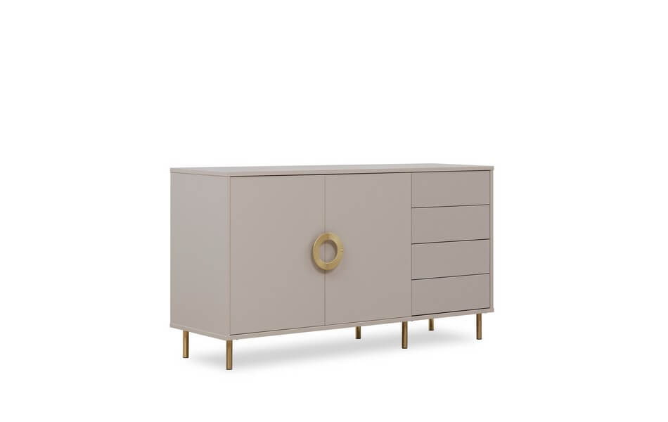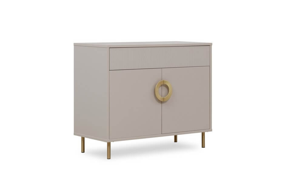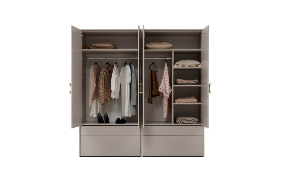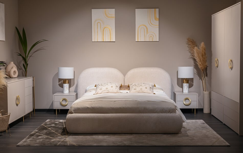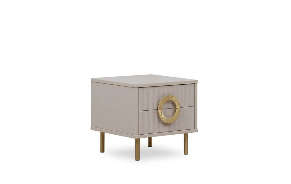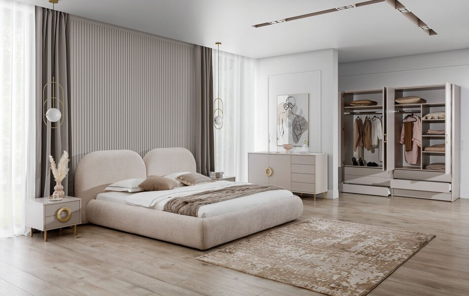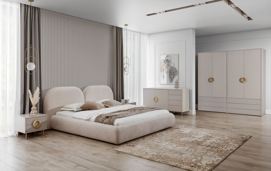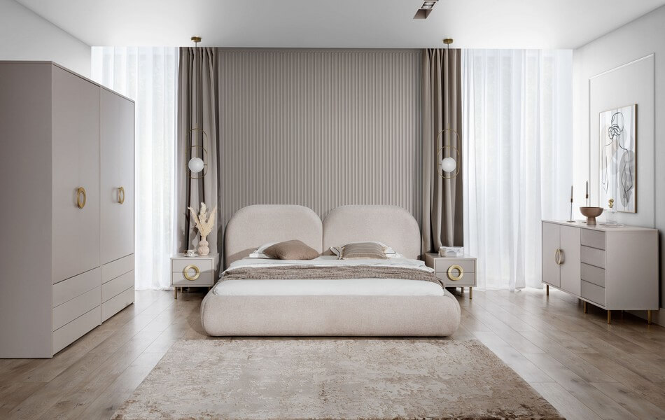Kolekcja mebli Nubo to elegancki zestaw sypialniany w pastelowych kolorach. W skład kolekcji wchodzą dwie różnorodne szafy, dwie komody, stoliki nocne oraz tapicerowane łóżko z charakterystycznym wezgłowiem. Ryflowane fronty i złote, matowe uchwyty dodają meblom szyku, a złote nóżki komód i stolików nocnych idealnie dopełniają całości.