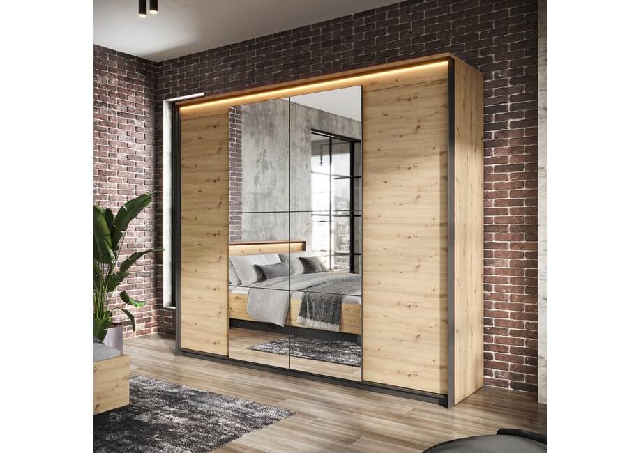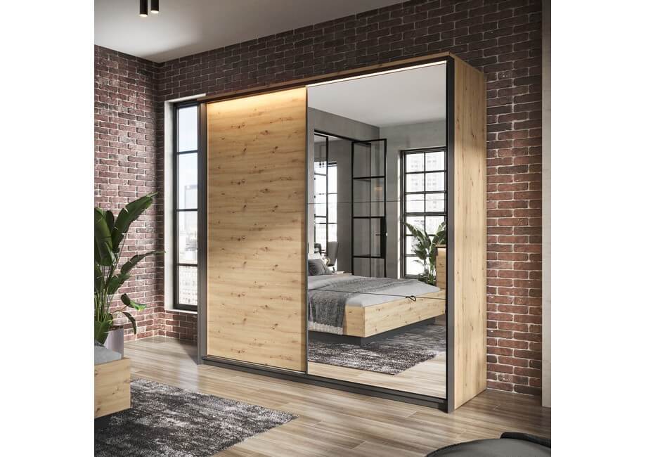 Kolekcja mebli loftowych do sypialni QUANT posiadają niezwykły urok, to zasługa połączenia ciekawej formy, dekoru o ciepłej barwie drewna z wyraźnym usłojeniem oraz detali w kolorze matowej czerni.