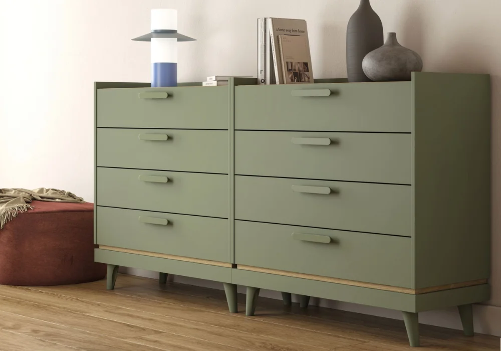 Dwa warianty wykończenia – dąb z ceglastoczerwonym akcentem lub dąb w odcieniu wyblakłej zieleni.
