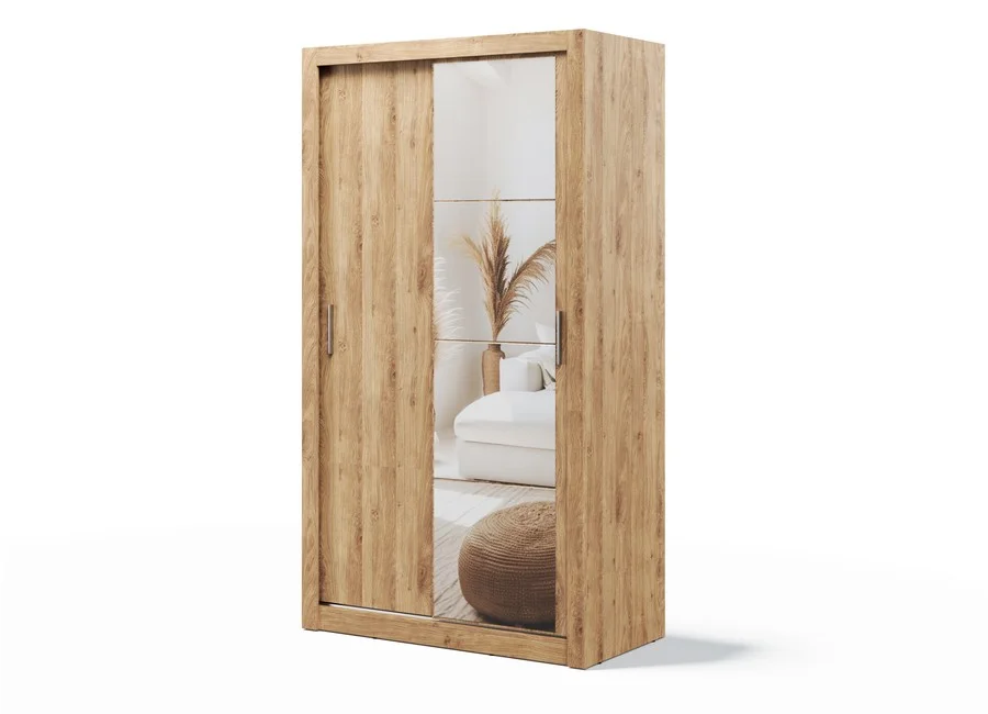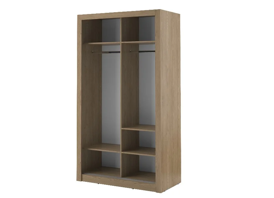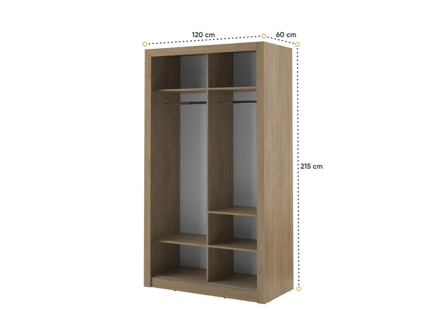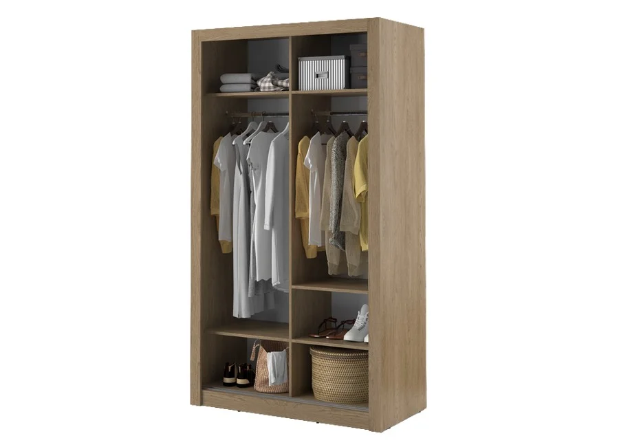 Mebel wykonany jest z trwałej płyty laminowanej o grubości 16 mm, wykończonej odpornymi na uszkodzenia obrzeżami ABS. Aluminiowe prowadnice zapewniają płynne i ciche przesuwanie drzwi. Szafa dostępna jest w eleganckim odcieniu dąb Shetland, a na zamówienie również w kolorach czarnym, szarym oraz bieli, co pozwala na dopasowanie mebla do różnych stylów aranżacyjnych