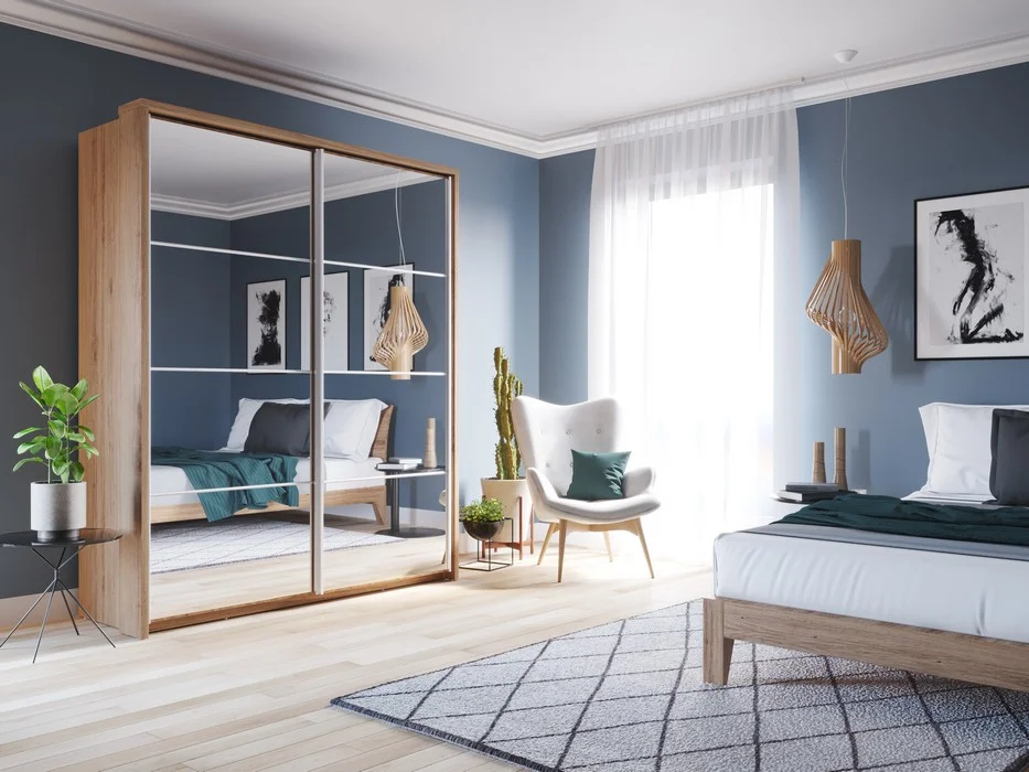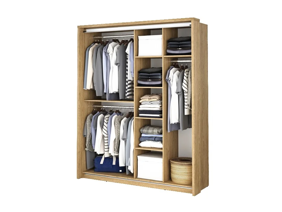 Wnętrze szafy zostało zaprojektowane z myślą o maksymalnej funkcjonalności. Znajdują się w nim trzy drążki na wieszaki, które umożliwiają przechowywanie zarówno krótszych ubrań, jak i długich płaszczy, a także pojemne półki idealne na złożone elementy garderoby.