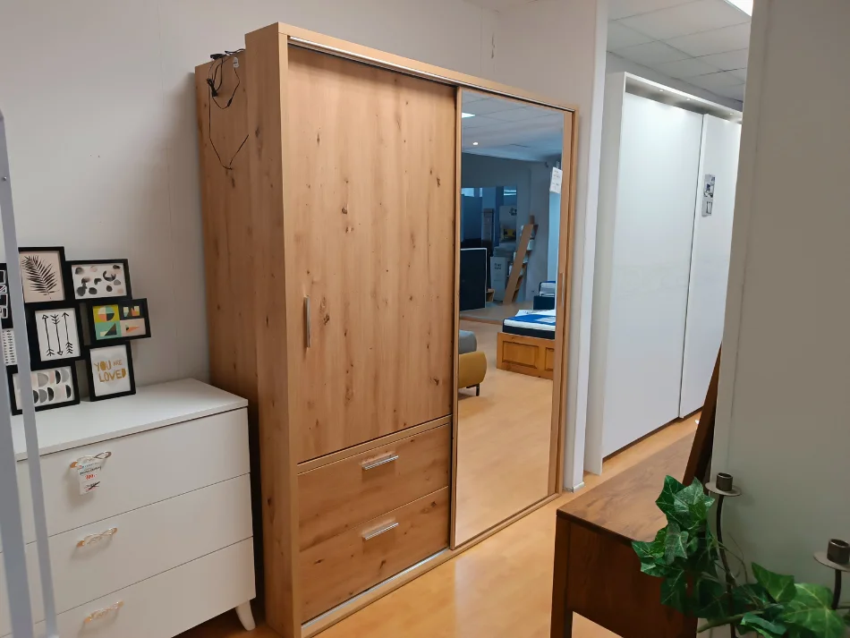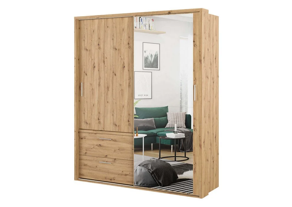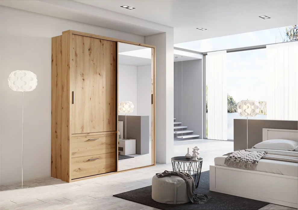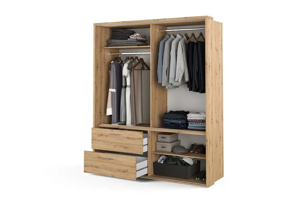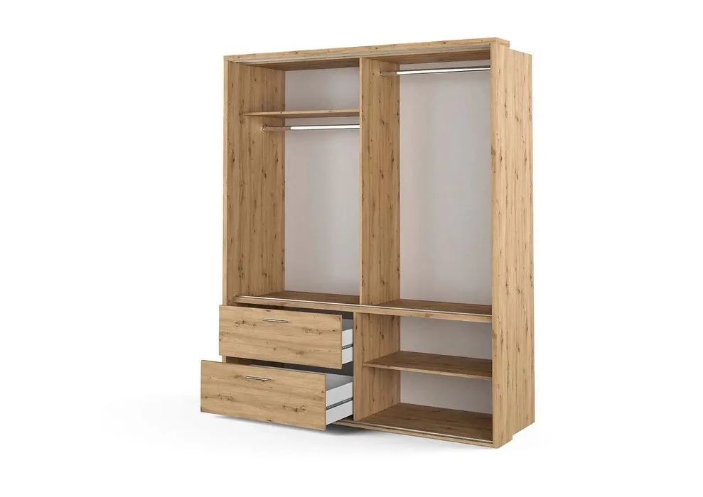 Wnętrze szafy zostało zaprojektowane z myślą o maksymalnej wygodzie użytkowania. Znajdziesz w niej dwa drążki umieszczone na różnych wysokościach, co umożliwia przechowywanie zarówno długich, jak i krótkich ubrań. Trzy pojemne półki zapewniają przestrzeń na odzież i dodatki, a dwie przestronne szuflady, wyposażone w prowadnice z pełnym wysuwem, gwarantują łatwy dostęp do całej zawartości.